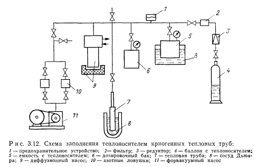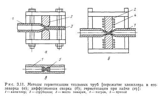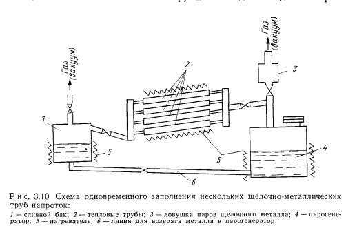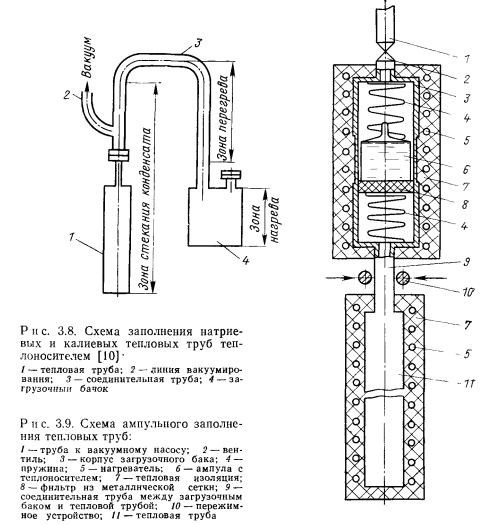 ЗАПОЛНЕНИЕ ТЕПЛОВЫХ ТРУБ ТЕПЛОНОСИТЕЛЯМИВысокотемпературные тепловые трубы. Для тепловых труб, работающих при повышенных температурах, важным вопросом является тщательная дегазация тепловой трубы и теплоносителя перед заполнением тепловой трубы. Метод вакуумной перегонки. На рис. 3.8 представлена схема заполнения тепловых труб натрием и калием, приведенная в работе [10]. Система заполнения предварительно обезгаживалась при вакуумировании в течение 4 ч при температуре 900° С. Необходимое количество теплоносителя загружалось в дистилляционный сосуд. Нагреватели и термопары позволяли поддерживать необходимый температурный режим в дистилляционном сосуде, опускной трубе, конденсационном ответвлении и тепловой трубе. При перегонке калия опускная и тепловая трубы первоначально нагревались сначала до 100° С, а конденсационное ответвление до 350° С. В дистилляционном сосуде в процессе перегонки поддерживалась температура около 400° С. ![]() Перегонка натрия осуществлялась при температуре опускной и тепловой труб, равной 150° С, температуре конденсационного ответвления — 450° С, дистилляционного сосуда — 500° С. В процессе перегонки конденсационное ответвление нагревалось конденсирующимися парами. Окончание процесса перегонки фиксировалось по повышению температуры в дистилляционном сосуде. Соединительный ниппель тепловой трубы затем тщательно расплющивали, отрезали н заваривали аргонно-дуговой сваркой на воздухе или электроннолучевой сваркой в вакууме. Вакуумная термическая перегонка теплоносителя в тепловую трубу позволяет избавиться от значительной части малолетучих примесей в теплоносителе (таких, как окислы калия и натрия), частично уменьшает содержание диссоциирующих примесей (гидриды в калии и натрии) и хорошо сочетается с задачей дегазации тепловой трубы. Ампульное заполнение. Схема такого заполнения представлена на рис. 3.9. Очищенный посредством дистилляции и обезгаживания при вакуумировании щелочной металл, герметизированный в стеклянной ампуле, помещается в тонкостенную емкость, расположенную над тепловой трубой. Заполнение проводится следующим образом. Отвакуумированная емкость с ампулой подогревается до температуры несколько выше температуры плавления щелочного металла. Затем ампулу раздавливают, сжимая стенки емкости, и жидкий щелочной металл сливается в тепловую трубу (при необходимости избыток оставляют на дне емкости). Далее щелочной металл замораживают в тепловой трубе и проводят «холодную отпайку» с последующей заваркой. Для этого всю сборку помещают в вакуумную камеру и, разрезав электронным лучом соединительный капилляр между емкостью с .ампулой и тепловой трубой, герметизируют последнюю посредством оплавления соединительного капилляра. Естественно, что перед заполнением проводится дегазация трубы. Такой способ заполнения прост, обеспечивает хорошую точность дозирования, позволяет тщательно обезгазить тепловую трубу. Недостаток способа — отсутствие возможности очистки щелочного металла после разгерметизации ампулы. Полное удаление неконденсирующихся газов для тепловых труб с щелочно-металлическими теплоносителями зачастую трудно осуществить (а такое удаление необходимо, например, для тепловых труб с составными фитилями). Для более тщательного удаления газов из трубы может