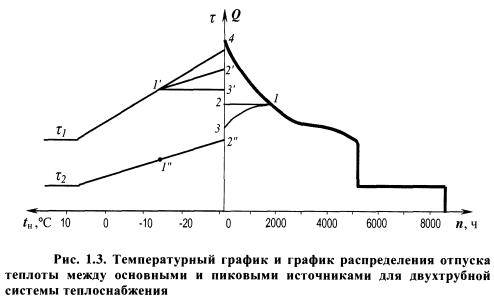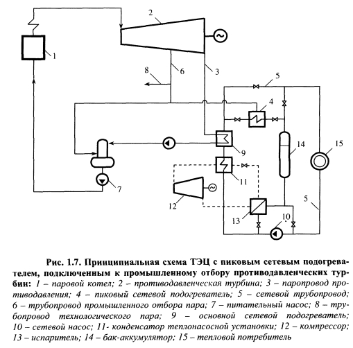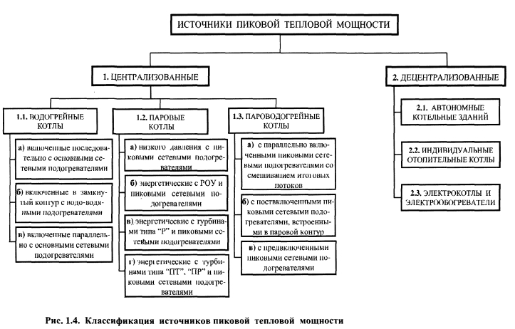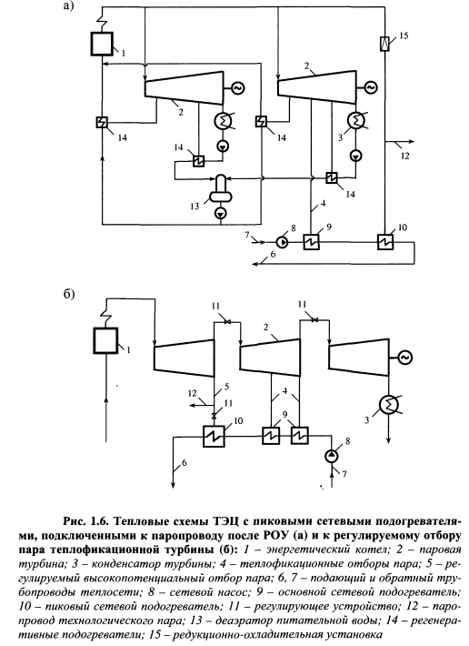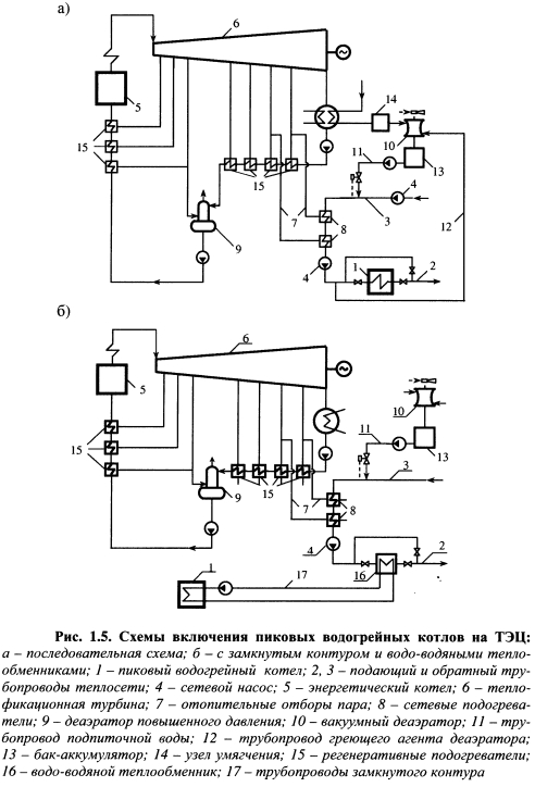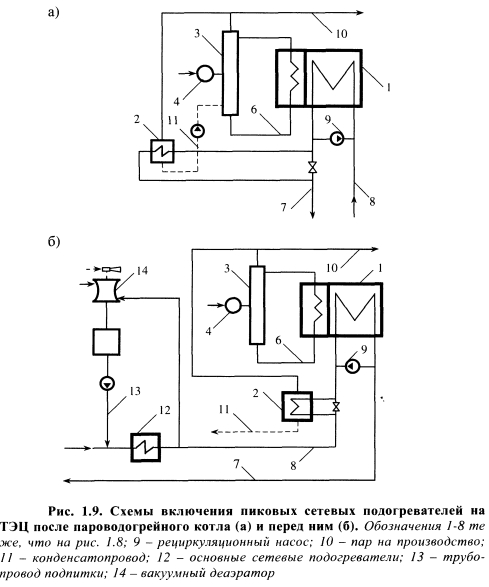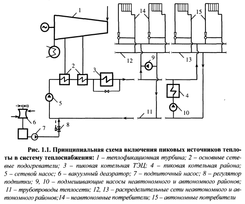 ОБЩАЯ ХАРАКТЕРИСТИКА ИСТОЧНИКОВ ПИКОВОЙ ТЕПЛОВОЙ МОЩНОСТИПиковые источники теплоты являются важнейшим элементом современных систем теплоснабжения. Источники пиковой тепловой мощности (ПТМ) предназначены для обеспечения расчетной тепловой нагрузки в наиболее холодные периоды года, когда основное теплофикационное оборудование полностью загружено и не может обеспечить требуемые параметры теплоносителя. Установленная мощность основного оборудования ТЭЦ (энергетических котлов и теплофикационных турбоустановок) традиционно подбирается из условия покрытия только базовой части основного потребления теплоты с таким расчетом, чтобы длительность использования максимальной производительности оборудования составляла не менее 5000 часов в году [81]. Остальная часть тепловой нагрузки (сверхбазовая или пиковая) отпускается непосредственно от источников пиковой тепловой мощности (ПТМ). Наиболее часто в качестве источников ПТМ используются пиковые водогрейные котлы, установка которых требует значительно меньших капитальных затрат, чем монтаж энергетических котлов и теплофикационных турбин с пиковыми сетевыми подогревателями. Поэтому во многих случаях сооружение новых ТЭЦ начинают со строительства пиковых котельных. До ввода в эксплуатацию теплофикационных установок ТЭЦ пиковые котельные являются основным источником теплоснабжения. После ввода в действие теплофикационных установок эти котельные используются по основному назначению - для покрытия пиковых тепловых нагрузок. Для обеспечения пиковой тепловой мощности могут быть также использованы паровые котлы низкого и среднего давления. Такое решение может оказаться более предпочтительным при работе на твердом топливе в связи с усложнением в этом случае конструкции водогрейных котлов [74]. При использовании паровых котлов сетевая вода после теплофикационных подогревателей проходит через пиковые пароводяные подогреватели, в которых осуществляется ее дополнительный подогрев за счет теплоты пара из пиковых паровых котлов. Основные данные о паровых котлах низкого и среднего давления и водогрейных котлах серийного производства приведены в прил. 1-4. В зависимости от территориального размещения и сроков сооружения ТЭЦ и тепловых потребителей пиковые котельные устанавливаются на площадке ТЭЦ или в районах теплопотребления. На рис. 1.1 показана одна из возможных принципиальных схем включения пиковых источников теплоты в систему теплоснабжения. ![]() В рассматриваемом случае в районе имеются два источника теплоснабжения: ТЭЦ и пиковая котельная района (ПКР). К воде, поступающей по обратному трубопроводу теплосети на ТЭЦ, теплота подводится из отборов теплофикационных турбин 1 в сетевых подогревателях 2 и от пиковых водогрейных котлов, установленных в пиковой котельной ТЭЦ (ПКТ). Сетевые подогреватели 2 и ПКТ 3 включены последовательно по сетевой воде, а расположенная на удалении от ТЭЦ ПКР 4 - параллельно. Тепловые потребители 14, расположенные между ТЭЦ и ПКР, снабжаются теплотой из подающей магистрали теплосети, температура воды в которой определяется режимом подогрева на ТЭЦ. Таких потребителей принято называть неавтономными. Когда температурный график теплосети от ТЭЦ не соответствует режиму теплопотребления неавтономных абонентов, в системе теплоснабжени