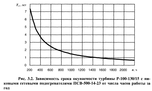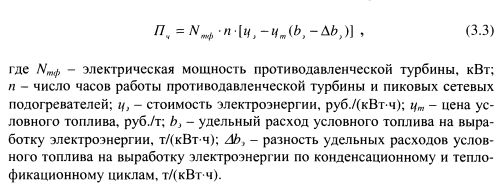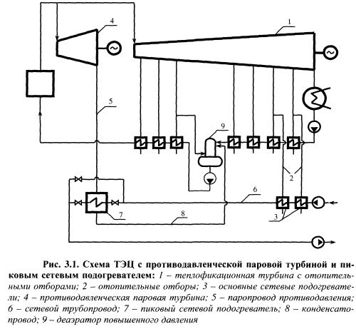 ОСОБЕННОСТИ СОВМЕСТНОЙ РАБОТЫ ПАРОВЫХ ТУРБИН С ПРОТИВОДАВЛЕНИЕМ И ПИКОВЫХ СЕТЕВЫХ ПОДОГРЕВАТЕЛЕЙОдним из способов повышения эффективности обеспечения пиковых тепловых нагрузок является замена ненадежно работающих и неэкономичных пиковых водогрейных котлов на пиковые сетевые подогреватели. Пиковые сетевые подогреватели могут быть подключены непосредственно к паропроводам котлов через редукционно-охладительную установку (РОУ), в которой понижаются параметры пара до требуемой величины. Использование вместо РОУ противодавленческой турбины позволяет не терять, а полезно использовать потенциал парового потока для получения электроэнергии на тепловом потреблении. После турбины пар противодавления подается на пиковые сетевые подогреватели, где используется для подогрева сетевой воды [59]. Поступающую от потребителей сетевую воду нагревают в базовом режиме тепловой нагрузки паром отопительных отборов в основных сетевых подогревателях теплофикационных турбин, а в пиковом режиме дополнительный нагрев сетевой воды осуществляют в пиковых сетевых подогревателях паром противодавления противодавленческих паровых турбин (рис. 3.1). Пароводяные подогреватели менее подвержены температурным разверкам по сравнению с водогрейными котлами. Максимальная температурная разверка между некоторыми трубами в водогрейном котле достигает 40-50 °С. Чтобы предотвратить пережог труб, необходимо обеспечить достаточно высокое качество противонакипной обработки подпиточной воды теплосети, которое достигается в установках ионообменного умягчения. Во всем поверхностном пароводяном теплообменнике разверки температур не превышают 5 °С, поэтому противонакипная обработка подпиточной воды может производиться по упрощенной технологии с помощью ультразвуковых установок или дозирования в тракт подпиточной воды хорошо зарекомендовавших себя антинакипинов, таких как ОЭДФ-Zn, ИОМС-1 и их аналогов. Осуществление дополнительного нагрева сетевой воды в пиковых сетевых подогревателях паром противодавления противодавленческих паровых турбин позволяет исключить из схемы ненадежно работающие пиковые водогрейные котлы, а также повысить надежность и экономичность работы тепловой электрической станции за счет снижения повреждаемости пиковых источников тепловой мощности, повышения выработки электроэнергии на тепловом потреблении, снижения затрат на противонакипную обработку подпиточной воды теплосети. Применение паровых турбин с противодавлением для покрытия пиковой тепловой мощности позволяет при капитальных затратах, сопоставимых с затратами на водогрейные котлы, повысить коэффициент теплофикации до 1 и маневренность покрытия электрической и тепловой нагрузки. ![]() Главным статическим показателем маневренности энергоблока является регулировочный диапазон изменения электрической мощности [5], т.е. разность между ее максимально возможным iVmax и технически минимальным значениями Nmm. Величина регулировочного диапазона ANP выражается в процентах от максимальной мощности ![]() Если в качестве примера рассмотреть ТЭЦ, на которой установлены одна турбина Т-100-130 и в качестве источника пиковой тепловой мощности пиковые сетевые подогреватели с противодавленческой турбиной Р-100-130/15, то регулировочный диапазон такой ТЭЦ составит 50-60%. Капи