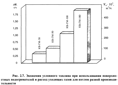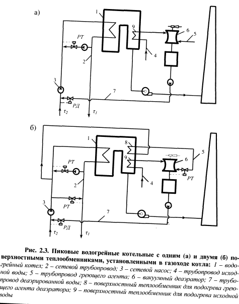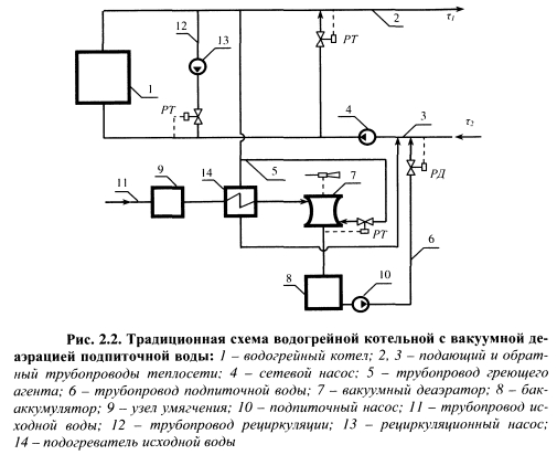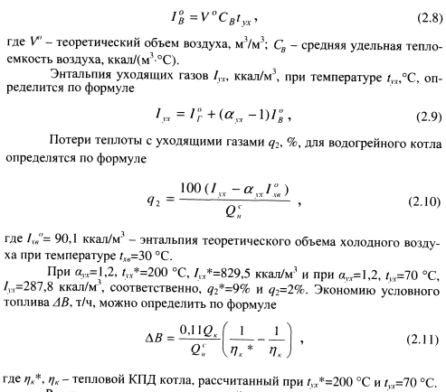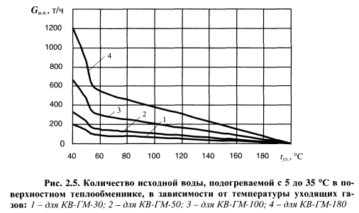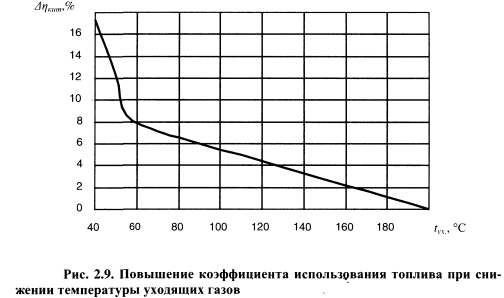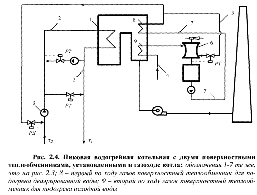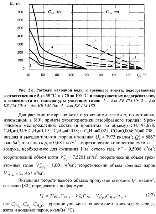 ПОВЫШЕНИЕ ТЕПЛОВОЙ ЭКОНОМИЧНОСТИ ПИКОВЫХ ВОДОГРЕЙНЫХ КОТЛОВ ПУТЕМ СНИЖЕНИЯ ПОТЕРЬ ТЕПЛОТЫ С УХОДЯЩИМИ ГАЗАМИВ рамках сформулированного в § 1.5 нового подхода к эффективности обеспечения пиковой тепловой мощности на тепловых электростанциях разработан ряд новых технических решений, позволяющих повысить тепловую экономичность пиковых водогрейных котельных путем использования теплоты уходящих газов. Основная проблема при разработке новых технологий, позволяющих снизить потери теплоты с уходящими газами q2, заключается в поиске теплоносителей, с помощью которых можно обеспечить достаточно глубокое охлаждение уходящих газов при приемлемых капитальных затратах. Нами установлено, что наибольшие возможности снижения q2 имеются в пиковых водогрейных котельных с вакуумными деаэраторами подпиточной воды. Исследования показывают, что на эффективность процесса деаэрации существенно влияют температурный режим и нагрузка вакуумных деаэраторов. Наиболее полный материал по эффективности струйно-барботажных вакуумных деаэраторов получен при многофакторном экспериментальном исследовании аппаратов горизонтального и вертикального типов [95]. В результате исследований получены математические модели вакуумных деаэраторов. Зависимость остаточного содержания 02, мкг/дм3, в деаэрированной воде от нагрузки вакуумного деаэратора ДВ-800 представлена графически на рис. 2.1. По графику хорошо видно, что чем выше температура исходной воды, тем меньше остаточное содержание кислорода в деаэрированной воде, т.е. перед деаэрацией необходимо осуществлять подогрев исходной воды, затрачивая на это определенное количество теплоты. В традиционных схемах водогрейных котельных (рис. 2.2) подогрев исходной воды осуществляется в поверхностных водо-водяных теплообменниках с помощью прямой сетевой воды, которая нагревается в котлах и служит греющим агентом в поверхностных теплообменниках и в вакуумном деаэраторе. Наряду с высокой температурой уходящих газов за котлами, недостатком такой схемы является значительный расход топлива на подогрев дополнительного потока сетевой воды, что снижает экономичность котельной. ![]() С целью повышения экономичности водогрейных котельных необходимо совместить процессы подогрева воды и утилизации теплоты уходящих газов [110, 114]. В газифицированных водогрейных котельных утилизация теплоты уходящих газов может производиться в подогревателях контактного или поверхностного типов. Как уже отмечалось ранее, недостатками подогревателей контактного типа являются ограниченная температура нагрева воды, примерно равная температуре кипения воды при парциальном давлении водяных паров в дымовых газах, и насыщение нагреваемой воды при контакте с газами, содержащимися в них продуктами сгорания, которые загрязняют воду и ограничивают ее использование в цикле водоподготовки. Использование подогревателей поверхностного типа позволяет значительно расширить возможности применения нагретой уходящими газами воды в схеме котельной. Поверхностные подогреватели также подразделяются на конденсационные теплоутилизаторы и подогреватели «сухого» теплообмена. В конденсационных теплоутилизаторах использование скрытой теплоты конденсации содержащихся в продуктах сгорания водяных паров увеличивает коэффициент теп