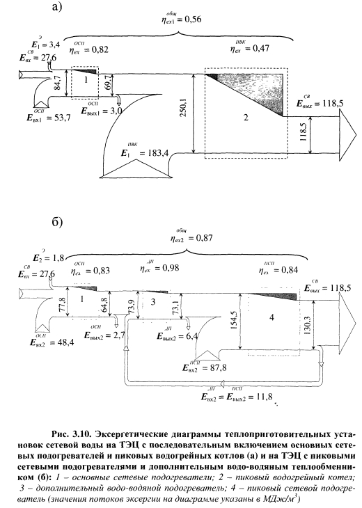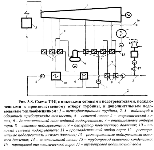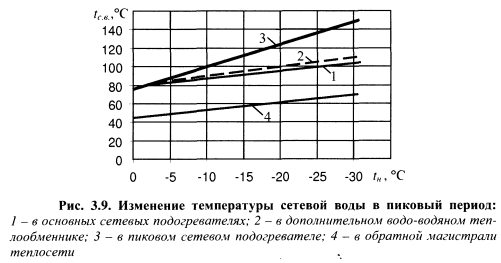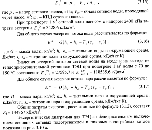 СОВЕРШЕНСТВОВАНИЕ ТЕХНОЛОГИИ РАБОТЫ ТЭЦ С ПИКОВЫМИ СЕТЕВЫМИ ПОДОГРЕВАТЕЛЯМИ, ПОДКЛЮЧЕННЫМИ К ПРОМЫШЛЕННЫМ ОТБОРАМ ПАРА ТУРБИНС целью более эффективного использования избытков пара производственных отборов турбин, увеличения выработки электроэнергии на тепловом потреблении и повышения надежности и экономичности источников пиковой тепловой мощности разработана усовершенствованная технология работы ТЭЦ с пиковыми сетевыми подогревателями [160, 161] (рис. 3.8). Сущность этой технологии заключается в том, что пиковая тепловая нагрузка полностью обеспечивается в пиковых сетевых подогревателях и дополнительном водо-водяном теплообменнике. Конденсатом, образующимся в пиковом сетевом подогревателе, подключенном к производственному отбору пара, нагревают сетевую воду после основных сетевых подогревателей и перед пиковым подогревателем в дополнительном водо- водяном теплообменнике, после чего конденсат направляют в трубопровод основного конденсата между вторым и третьим по ходу основного конденсата турбин подогревателями низкого давления. ![]() Распределение подогрева между основными и пиковым сетевыми подогревателями и дополнительным водо-водяным теплообменником показано на рис. 3.9. Из графика видно, что основной подогрев сетевой воды (88-90%) осуществляется в пиковом сетевом подогревателе, а доля нагрева в дополнительном водо-водяном теплообменнике достигает 10-12%. Рассмотрим пример реализации этой технологии. Сетевую воду, поступающую от потребителей с температурой 40-50 °С в количестве 1800 т/ч, подают по трубопроводу сетевой воды 3 насосом 4 в основные сетевые подогреватели 8 типа ПСГ-1300-3-8-1 паровой турбины 1 типа ПТ -135-130/15, где нагревают паром отопительных отборов 7 с параметрами 0,06-0,15 МПа до температуры 100-105 °С, затем сетевую воду нагревают в водо-водяном подогревателе 6 на 2-4 °С конденсатом из пароводяного пикового сетевого подогревателя 10 типа ПСВ-500-14-23. После водоводяного подогревателя 6 сетевую воду нагревают паром из производственного отбора 11 с параметрами 1,2-5-1,4 МПа в пиковом сетевом подогревателе 10 до температуры 130-150 °С, необходимой для покрытия пиковой нагрузки системы теплоснабжения, и подают в теплосеть. Из водоводяного подогревателя 6 конденсат конденсатным насосом 14 подают в трубопровод основного конденсата 15 между вторым и третьим по ходу движения конденсата подогревателями низкого давления 12, благодаря чему обеспечивают дополнительную выработку электроэнергии на тепловом потреблении. После подогревателей низкого давления 12 конденсат подают в деаэратор 9. Из отбора 11 пар по паропроводу 16 отпускают промышленным потребителям. Подпиточную воду подготавливают по упрощенной технологии и подают в теплосеть по трубопроводу 17. ![]() За счет нагрева сетевой воды в дополнительном водо-водяном теплообменнике конденсат после пикового сетевого подогревателя дополнительно охлаждается, что способствует увеличению выработки электроэнергии на тепловом потреблении. Для рассматриваемого примера среднегодовая величина электрической мощности, развиваемой турбиной на тепловом потреблении, /Vw=15910 кВт, при этом годовая экономия условного топлива, рассчитанная по формуле 3.4, составляет 3980 т. Для сравнения энергетической эффективности процессов нагрева и транспорта сетевой воды на ТЭЦ по схемам, изображенным на рис. 1