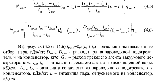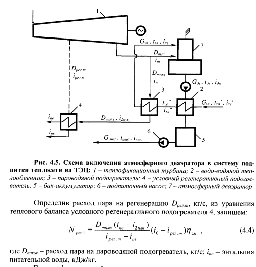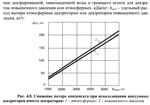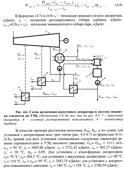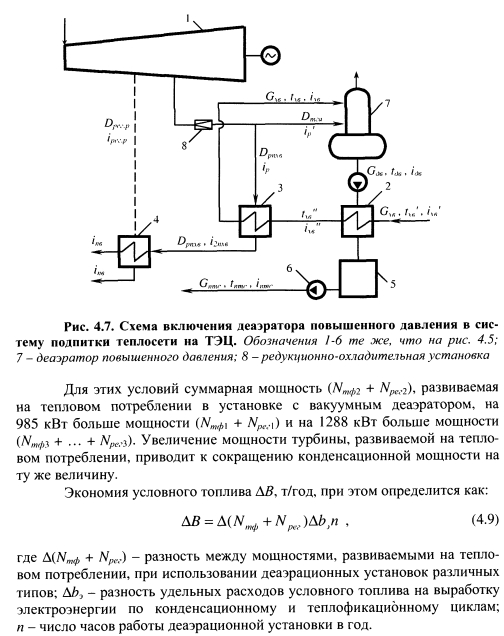 ТЕХНИКО-ЭКОНОМИЧЕСКОЕ СРАВНЕНИЕ РАЗЛИЧНЫХ СПОСОБОВ ТЕРМИЧЕСКОЙ ДЕАЭРАЦИИ ВОДЫ В ПИКОВЫХ ТЕПЛОИСТОЧНИКАХ ТЭЦОдним из важнейших условий повышения надежности источников пиковой тепловой мощности является совершенствование противокоррозионной обработки подпиточной воды тепловых сетей. Основным средством удаления коррозионно-активных газов (02 и С02) из воды на тепловых электростанциях и в котельных является термическая деаэрация. В соответствии с классификацией термических деаэраторов по давлению [22] существуют три способа деаэрации в аппаратах вакуумного (ДВ) и атмосферного (ДА) типов и в деаэраторах повышенного давления (ДП). Наиболее часто для деаэрации подпиточной воды теплосети в пиковых теплоисточниках электростанций применяются вакуумная и атмосферная деаэрация. Деаэраторы повышенного давления применяются главным образом для деаэрации питательной воды паровых котлов. Сравним все три способа деаэрации применительно к пиковым теплоисточникам. С физико-химической точки зрения, согласно закону Генри, чем выше температура, тем меньше растворимость газов в воде, и тем интенсивнее идет процесс десорбции. В соответствии с ГОСТ 16860-88 [22] наименьшее содержание 02 в деаэрированной воде обеспечивается после деаэратора повышенного давления (10 мкг/дм3), среднее - после атмосферного (20 мкг/дм3), наибольшее - после вакуумного (50 мкг/дм3). Деаэраторы атмосферного типа имеют небольшую единичную производительность, поэтому для подготовки больших объемов подпиточной воды теплосети требуется установка большего количества аппаратов по сравнению с деаэраторами двух других типов. Недостатком деаэраторов повышенного давления является необходимость обеспечения высоких температурных параметров теплоносителей, подаваемых в деаэратор. В вакуумном деаэраторе, несмотря на мгновенное выделение некоторого количества газов при подаче воды в него, процесс дегазации воды из-за вакуума происходит труднее, поэтому для достижения такой же глубины дегазации, как и при атмосферном давлении, интенсивность обработки воды в вакуумном деаэраторе должна быть выше, чем в атмосферном. Деаэрационные установки являются неотъемлемой частью оборудования электростанций, поэтому окончательный вывод о целесообразности применения того или иного типа деаэратора можно сделать лишь в том случае, когда деаэратор рассматривается не только как дегазационный аппарат, но и как элемент тепловой схемы электростанции. Решающим обстоятельством при выборе типа деаэратора чаще всего оказывается влияние способа дегазации на тепловую экономичность пикового теплоисточника и ТЭЦ в целом. Рассмотрим характерные схемы дегазации подпиточной воды теплосети в источниках пиковой тепловой мощности электростанций (рис. 4.5-4.7). В качестве критерия при сравнении тепловой экономичности теплофикационных установок с деаэраторами удобно принять величину мощности Nmp турбоустановки, развиваемой на тепловом потреблении за счет отборов пара на подогрев теплоносителей, подаваемых в деаэратор. В общем случае Nmp, кВт, найдется как: ![]() Типовая схема включения атмосферного деаэратора на ТЭЦ представлена на рис. 4.5. Умягченная (химически очищенная) вода перед поступлением в ДА 7 подогревается в водо-водяном теплообменнике 2 и пароводяном подогревателе 3. В деаэратор и подогреват