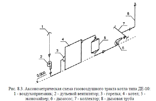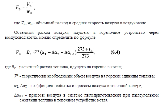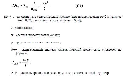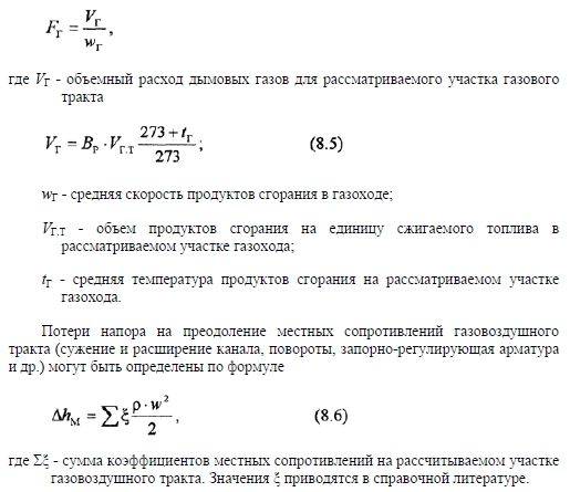 Аэродинамический расчет газовоздушного тракта котла, работающего на искусственной тягеЗадачей аэродинамического расчета газовоздушного тракта котла в случае использования искусственной тяги является определение аэродинамических сопротивлений воздушного и газового трактов и подбор требуемых дутьевого вентилятора и дымососа, а также расчет минимально требуемой высоты дымовой трубы, исходя из условий рассеивания вредных выбросов в атмосферном воздухе. Расчеты газовоздушного тракта проводятся лишь после того, как сделан тепловой расчет котла и определены температуры и расходы воздуха и продуктов сгорания по всему газовоздушному тракту. Следует отметить, что тягодутьевое оборудование теплогенерирующей установки рассчитывается на максимальную тепловую нагрузку котла (в учебных проектах - на номинальную) с целью обеспечения его нормальной работы при всех возможных режимах. Аэродинамический расчет газовоздушного тракта котла следует вести в соответствии с требованиями нормативного метода, изложенного в [5]. Однако такой расчет является достаточно сложным и требует большого объема вычислений. В связи с этим в учебных целях, при курсовом и дипломном проектировании теплогенерирующих установок обычно ограничиваются выполнением упрощенного аэродинамического расчета газовоздушного тракта котла. Суть такого расчета в том, что сопротивление отдельных элементов котла не рассчитывается, а принимается по справочной литературе. Расчету подвергаются только те участки газовоздушного тракта котла, данные по аэродинамическим сопротивлениям которых отсутствуют в справочной литературе. Перед тем как начать аэродинамический расчет газовоздушного тракта, необходимо построить его аксонометрическую схему, на которой указывают все элементы этого тракта, отметки высот, на которых находятся центры входных и выходных сечений газоходов, и др. При проектировании теплогенерирующей установки дутьевые вентиляторы и дымососы обычно располагают на нулевой отметке (нижнее расположение). Иногда по техническим или иным соображениям они могут устанавливаться на некоторой высоте на специальных площадках (верхнее расположение), однако это обычно усложняет и удорожает стоимость проекта. На котлах малой и средней мощности используются один дутьевой вентилятор и один дымосос, при этом на котельную предусматривается одна дымовая труба. Аэродинамическое сопротивление какого-либо участка газовоздушного тракта АН складывается из аэродинамических сопротивлений на преодоление сил трения АНТР и местных сопротивлений АНМ ![]() Сопротивление трения возникает из-за действующих в потоке газов сил трения между частицами при движении их в канале и может быть рассчитано по известной формуле ![]() Скорость газа в канале и его плотность должны определяться по его средней температуре. Для воздуховодов котла обычно при расчетах принимают, что средняя скорость воздуха должна быть в пределах 6...10 м/с, тогда с учетом этого можно определить проходное сечение воздуховода ![]() Сопротивления трения при скоростях холодного воздуха и продуктов сгорания менее 10 м/с в аэродинамических расчетах газовоздушного тракта котла часто не учитываются ввиду их малых значений по сравнению с местными сопротивлениями. При проектировании газоходов котла скорость газ