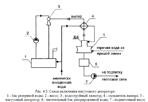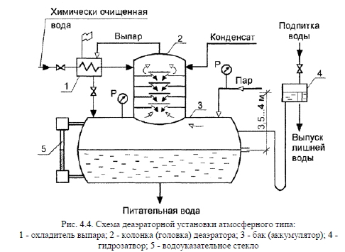 Деаэрация водыВ химически очищенной воде находятся относительно нейтральные (N2 и NH3 и др.) и агрессивные (О2 и СО2) газы, последние приводят к химической коррозии внутренних поверхностей нагрева котла. Кроме этого, продукты коррозии нарушают циркуляцию воды в контуре котла, что может привести, в конечном итоге, к пережогу труб. Поэтому коррозионно-активные газы необходимо удалять из воды. Для этого существует несколько способов - химическая, каталитическая, термическая деаэрация. Сущность химической деаэрации заключается в следующем - в воду добавляют сульфит натрия (Na2SO3), который окисляется до сульфата натрия (Na2SO4), забирая из воды кислород. При каталитической деаэрации воды коррозионно-активные газы удаляются из воды водородом. Основным способом удаления газов из воды в теплогенерирующих установках в настоящее время остается термическая деаэрация, которая основана на использовании закона растворимости газов в жидкости (закон Генри). Согласно этому закону количество растворенного газа ОГ в единице объема жидкости прямо пропорционально парциальному давлению газа над жидкостью ![]() Растворимость газа в воде при ее нагреве снижается в соответствии с законом Генри, т.к. давление пара стремится к давлению насыщения, т.е. РП Р, а РГ 0, При кипении, когда РП = Р, из воды удаляются все газы. Удаление газов из воды в теплогенерирующих установках осуществляется в специальных устройствах - термических деаэраторах, в которых также происходит подогрев воды до кипения. Деаэраторы подразделяются по рабочему давлению на три вида: - вакуумные (Р < 0,03...0,093 МПа) ; - атмосферные (Р = 0,12 МПа); - повышенного давления (Р > 0,12 МПа). В теплогенерирующих установках малой и средней мощности обычно используются на водогрейных котлах вакуумные деаэраторы и на паровых котлах - атмосферные деаэраторы. ![]() Принципиальная схема деаэраторной установки атмосферного типа показана на рис. 4.4. Деаэратор состоит из двух основных частей - деаэраторного бака 3 и деаэраторной колонки 2. Химически очищенная вода поступает через охладитель выпара 1 в верхнюю часть колонки деаэратора. Сюда же подается конденсат от сетевых подогревагелей. Вода стекает по распределительным тарелкам (по всему сечению колонки) вниз, в бак, и нагревается за счет пара, который движется вверх. Для измерения давления пара имеются манометры на паропроводе и баке. При нагреве воды из нее выделяются газы, которые с частью пара из верхней части колонки поступают в охладитель выпара. Там оставшийся пар конденсируется, и конденсат возвращается по сливной трубке в деаэратор, а газы выходят в атмосферу. Освобожденная в деаэраторе от газов питательная вода из нижней части бака направляется к котлам. Температура подогрева воды в деаэраторе атмосферного типа обычно лежит в пределах 102...104 °С, что соответствует давлению в деаэраторе 0,12 МПа. При превышении давления в деаэраторе относительно рабочего может произойти его разрыв, а при разрежении атмосферное давление может деформировать деаэратор. Чтобы этого не произошло, деаэратор оборудуется гидрозатвором 4, как показано на рис. 4.4. Гидрозатвор устанавливается высотой 3,5...4 м относительно уровня воды в деаэраторе, диаметр трубы гидрозатвора берется обычно 70 мм. При уходе воды из деаэратора и создании в нем разрежения подпиточная вода поступает из гидрозатвор