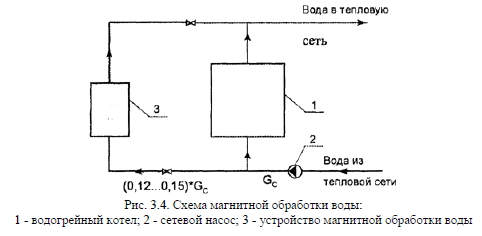 Другие методы умягчения водыСуществуют и другие методы очистки исходной воды, к которым следует отнести электродиализ, магнитный и ультразвуковой методы, метод обратного осмоса, ультрафильтрацию и др. Электродиализ - ионообменный процесс, схожий с действием описанных выше ионообменных фильтров и отличающийся тем, что ионообменный слой заменен ионообменными мембранами (пористыми пленками), получаемыми полимеризацией смеси реагентов. Для упрочнения мембран их формируют на металлических сетках. Используют данный метод в основном для опреснения соленых вод. Под действием постоянного электрического тока, поданного на мембраны, последние способны пропускать только катионы или только анионы. В результате этого через мембрану проходит только чистая вода без солей жесткости. Магнитный метод очистки воды достаточно часто применяется в отопительных котельных. При этом методе на воду воздействуют магнитным полем определенной напряженности и полярности. После этого при нагревании воды в котле из нее выпадают соли жесткости в виде шлама, которые удаляются продувкой из нижних точек котла. На поверхностях нагрева накипные отложения не образуются. Данный метод применяют для вод с преимущественно карбонатной жесткостью величиной до 6...8 мг-экв/кг, содержанием железа до 0,3 мг/кг и содержанием кислорода до 0,3 мг/кг. Обычно используют одну из двух схем магнитной обработки воды. Первая схема предназначена для паровых котлов с температурой среды более 100 °С. В этом случае соли выделяются в толще воды в виде шлама, который необходимо непрерывно удалять из нижних слоев во избежание образования вторичной накипи. Поэтому данная схема предусматривает обязательную установку автоматического шламоотделителя после аппарата магнитной обработки воды. По второй схеме, которая используется для водогрейных котлов с температурой подогрева воды до 95 °С, вода остается прозрачной и осадка в виде шлама не образуется. Омагниченные свойства воды сохраняются от 8 до 10 часов. Для постоянного поддержания омагниченных свойств воды в схеме (рис. 3.4) предусматривается антирелаксационный контур, через который должно проходить не менее 12... 15% объема воды, циркулирующей в системе. Следует заметить, что магнитные аппараты должны иметь биологическую защиту, чтобы устранить вредное воздействие на обслуживающий персонал, и устанавливаются обычно в помещениях, где нет постоянного пребывания людей. ![]() Ультразвуковая обработка воды осуществляется за счет воздействия на котловую воду ультразвуковыми колебаниями частотой 20...30 кГц, за счет чего создаются условия кавитации воды (непрерывное образование и исчезновение внутренних разрывов сплошности воды, т.е. происходит резкое понижение давления воды в отдельных точках и ее вскипание, а т.к. вода недогрета до кипения, то затем происходит такая же резкая конденсация пара и схлопывание пузырька). При схлопывании микропузырьков развиваются гидравлические микроудары, в результате чего происходит очистка внутренних поверхностей труб от образовавшейся накипи и предотвращение образования новой. Рабочая толщина слоя накипи при таком способе обработки воды не превышает 0,1 мм. На металл труб ультразвук данной частоты не оказывает вредного влияния, а под его воздействием происходит пассивирование поверхностного слоя