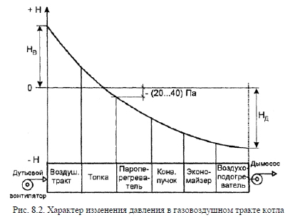 Использование искусственной тяги в котлахВ современных теплогенерирующих установках продукты сгорания, выбрасываемые из дымовой трубы, имеют достаточно низкую температуру, а газовоздушный тракт - значительное аэродинамическое сопротивление. Поэтому такие установки не могут работать на использовании естественной тяги, в них должна быть использована искусственная тяга, создаваемая с помощью дутьевых вентиляторов и дымососов. При этом основное назначение дымовой трубы при искусственной тяге становится другим - отвод продуктов сгорания в атмосферу на такую высоту, чтобы были выполнены санитарно-гигиенические нормы по рассеиванию вредных газовых выбросов из трубы. Теплогенерирующие установки малой и средней мощности работают обычно на "уравновешенной" искусственной тяге, когда на выходе продуктов сгорания из топочной камеры в верхней ее части создается небольшое избыточное разрежение: 20...40 Па. При этом в воздушном тракте создается избыточное давление воздуха за счет работы дутьевого вентилятора, а в газовом тракте котла за топочной камерой создается разрежение за счет работы дымососа, как показано на рис. 8.2. ![]() Считается, что это один из наиболее оптимальных вариантов работы газовоздушного тракта котла. Дутьевой вентилятор нагнетает воздух в воздушный тракт и создает при этом напор Нв. Этого напора достаточно, чтобы подать воздух в топочную камеру на горение. Разрежение в верхней части топочной камеры и в конвективных поверхностях котла (пароперегреватель, конвективный пучок, экономайзер, воздухоподогреватель) обеспечивается дымососом, при этом его напор должен быть равен Ид. Благодаря созданному в газоходах котла разрежению обеспечиваются хорошие санитарно-гигиенические условия работы обслуживающего персонала в котельном цехе, т.к. продукты сгорания не могут попасть в воздух котельного цеха. Вместе с тем, из-за разрежения в газоходах котла воздух из котельного цеха засасывается в газоходы, т.е. имеются присосы воздуха, что приводит к снижению эффективности работы теплогенерирующей установки. |