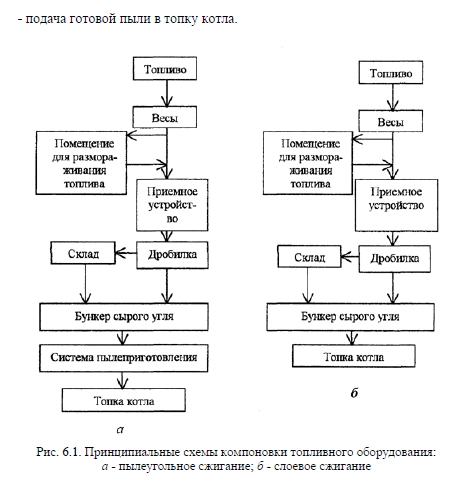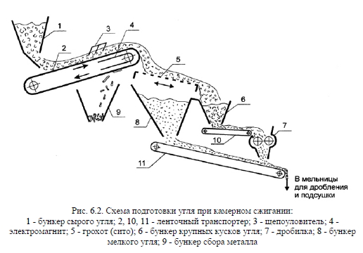 Топливное хозяйство при использовании твердого топливаТопливное хозяйство теплогенерирующих установок, работающих на твердом топливе, является часто наиболее сложным и дорогостоящим, особенно при пылеугольном сжигании. Принципиальная технологическая схема топливного хозяйства (в зависимости от типа сжигания) представлена на рис. 6.1. Твердое топливо от мест добычи до теплогенерирующей установки обычно доставляется железнодорожным, водным или автомобильным транспортом и затем взвешивается на весах (рис. 6.1, а). В зимний период времени влажное топливо при транспортировке может смерзнуться, что затруднит разгрузку или даже сделает ее невозможной. Поэтому такое топливо обычно размораживают в тепляках-сараях и только после этого производят его разгрузку в приемное устройство. Затем топливо дробится в дробилке до кусков требуемых размеров и направляется далее: в бункер сырого угля и далее в систему пылеприготовления и в топку котла; или направляется на склад, где оно хранится и может быть использовано по мере необходимости. При слоевом сжигании (рис. 6.1, б) система топливоподачи упрощается, т.к. не требуется дорогостоящая система пылеприготовления топлива. На практике для теплогенерирующей установки в каждом конкретном случае топливное хозяйство может видоизменяться. Например, при слоевом сжигании сортированных углей и кускового торфа (рис. 6.1, б) необходимость в применении дробильных устройств отпадает и система топливного хозяйства может быть значительно упрощена. При пылеугольном сжигании топлива в камерных топках требуется его подготовка, которая обычно состоит из нескольких последовательных стадий: - удаление металла и щепы из топлива; - грубое дробление; - подсушка и размол в системе пылеприготовления; - подача готовой пыли в топку котла. ![]() Условно эти стадии показаны на рис. 6.2. Уголь со склада поступает в бункер сырого угля 1, откуда он дозированно ленточным транспортером 2 подается на грохот 5. Для удаления из угля древесных включений, которые плохо подвергаются измельчению в дробилках, имеется щепоудалитель 3. Металлические части и включения из угля удаляются с помощью электромагнита 4 и попадают в бункер металла 9. Грохот 5, представляющий собой сита с определенным размером ячеек, позволяет мелким кускам угля просыпаться в бункер 8, а крупным кускам угля - скатываться в бункер 6, откуда ленточным транспортером 10 эти куски подаются в дробилку 7. В дробилке происходит размол кусков угля до требуемых размеров, и далее уголь направляется транспортером 11 в мельницы для подсушки и измельчения его в пыль. Хранение твердого топлива Запас топлива для работы котлов хранится непосредственно на территории теплогенерирующей установки, либо на специальных площадках (складах) недалеко от нее. При хранении топлива наблюдаются естественные потери, связанные: - с транспортировкой топлива (при проектировании теплогенерирующей установки они могут быть приняты равными до 1% от поступившего на склад топлива); - с распыливанием топлива и уносом его с атмосферными осадками и т.п. (величина потерь может быть принята при проектировании до 1%); - с выветриванием и окислением (озолением) топлива вследствие его самовозгорания (величина потерь может быть принята при проектировании теплогенерирующей установки при плохом качестве угля до 10