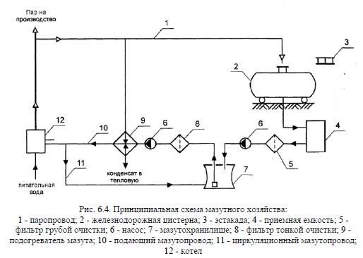 Топливное хозяйство при использовании жидкого топливаОбычно при работе тешюгенерирующей установки на жидком топливе используется мазут, реже нефть, солярка и др. В связи с этим рассмотрим топливное хозяйство теплогенерирующей установки на примере мазутного. Следует отметить, что мазут также часто используется в качестве резервного или аварийного топлива. Наиболее приемлемым способом доставки жидкого топлива от заводов переработки нефти до места нахождения тепло-генерирующей установки является железнодорожный, реже автомобильный и речной. Мазутное хозяйство теплогенерирующей установки обычно включает в себя: приемно-сливные устройства, мазутохранилища, насосные станции, мазуто- и паропроводы и др. Принципиальная схема мазутного хозяйства показана на рис. 6.4. Из железнодорожной цистерны 2 мазут сливают в приемную емкость 4. Для удобства обслуживания имеется эстакада 3. В период отрицательных температур мазут может потерять текучесть, и для его разогрева обычно используется пар от котлов теплогенерирующей установки 12, который подается по паропроводу 1 в цистерну. Из приемной емкости 4 мазут насосом 6 перекачивается в мазутохранилище 7, при этом перед насосом устанавливается фильтр грубой очистки 5. Из мазутохранилища 7 через фильтр тонкой очистки 8 насосом мазут подается в пароводяной подогреватель 9, где он нагревается за счет теплоты пара, подаваемого из котла. Подогретый мазут далее направляется по подающему мазутопроводу 10 к форсункам котла 12. Мазута по мазутопроводу 10 должно подаваться больше, чем это требуется для горения, чтобы излишек горячего мазута по циркуляционному мазутопроводу 11 возвращался в мазутохранилище 7. Это позволяет за счет рециркуляционной линии 11 поддерживать мазутопроводы всегда в горячем состоянии, даже в случае прекращения процесса горения в котле, а также иметь подогретый до требуемой температуры мазут в мазутохранилище 7. Иногда параллельно с мазутопроводами прямой и рециркуляционной линий прокладываются паропроводы-спутники, которые предназначены на случай нештатных ситуаций или пуска мазутопроводов в эксплуатацию и после ремонтов. Все мазутопроводы следует прокладывать с уклоном не менее 0,01. Для разогрева топлива в цистернах и его слива при отрицательных температурах окружающей среды могут быть использованы следующие способы. 1. Разогрев мазута в цистерне открытым паром давлением 0,6...1,0 МПа. Пар подают в цистерну через гибкие шланги, для чего используют эстакаду 3 (рис. 6.4). Время разогрева и слива мазута из цистерны составляет обычно от 6 до 9 часов. ![]() К недостаткам такого способа разогрева мазута следует отнести обводнение мазута (содержание воды в мазуте после разогрева может достигать 8% от массы мазута) и значительный расход пара (требуется до 100 кг пара на 1 тонну разогреваемого мазута). 2. Разогрев мазута в цистерне за счет его циркуляции. При этом способе горячий мазут подают в цистерну и организуют циркуляционный контур по горячему мазуту. Мазут, циркулирующий в этом контуре, подогревают в специальном теплообменнике. Температура подогрева мазута должна быть на 10...20 °С ниже, чем температура его вспышки. Рециркуляцию осуществляют до полного слива мазута из цистерны. К недостаткам такого способа следует отнести достаточно длительное время разогрева и необходимость созда
