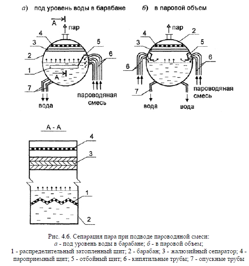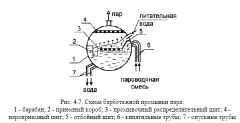 Подготовка пара в соответствии с нормативными требованиямиПар, направляемый потребителям, должен быть достаточно чистым для того, чтобы избежать отложений на внутренних поверхностях пароперегревателей и паропроводов. Качество вырабатываемого пара зависит от его влажности и концентрации веществ, загрязняющих котловую воду. Для пара с давлением менее 4 МПа требования к его качеству приведены в нормативной литературе [4]. Согласно требованиям к насыщенному пару, вырабатываемому в котлах без пароперегревателей, пар может иметь влажность до 1%, при этом его солесодержание не нормируется. Во влаге, содержащейся в паре, находится определенная часть солей, что и дает его солесодержание ?П, т.е. ![]() Для снижения влажности пара в барабане котла устанавливают различные сепарирующие устройства, которые отделяют капельки влаги от сухого пара. Различают несколько типов сепарации влаги: - гравитационную, когда отделение капель происходит под действием сил тяжести при горизонтальном или вертикальном движении пара с малой скоростью в трубопроводе (диаметр отделяемых капель составляет более 50 мкм); - инерционную (механическую), когда поток пара, двигающийся с относительно большой скоростью, резко изменяет направление движения или резко изменяется его скорость; - пленочную, когда поток пара проходит вдоль пленки жидкости, находящейся на твердой наклонной поверхности, и капли прилипают к этой пленке, при этом обеспечивается тесный контакт пара и пленки. При такой сепарации пленка жидкости все время дренирует по этой наклонной поверхности и подпитывается за счет выпадения из пара капелек влаги. ![]() Гравитационная сепарация в котлах практически не используется, т.к. требует малых скоростей потоков пара, а следовательно, больших объемов сепарационных устройств. Инерционная сепарация широко используется для очистки пара от влаги. Для этого применяют механические сепараторы, некоторые из них изображены на рис. 4.6. Обычно в барабане котла стараются достичь равномерного распределения пара по длине и сечению барабана, и этому способствует установка сепараторов в барабан котла. Принцип действия сепараторов понятен из рисунка: у отбойного щита 5 резко меняется направление потока пароводяной смеси, поступающей из кипятильных труб 6; в жалюзийном сепараторе 3 резко изменяется направление потока пара; в распределительном 1 и пароприемном 4 щитах резко изменяется скорость движения пара. Иногда для отделения капелек влаги используют центробежные сепараторы. Механической сепарацией можно очистить пар только от крупной водяной взвеси. Для отделения веществ в виде молекулярных и коллоидных растворов от пара используют различные паропромывочные устройства, в основе которых лежит пленочная сепарация. К таким устройствам относят: - устройства, разбрызгивающие воду в потоке пара; - устройства с пропуском пара около смоченной водой поверхности; - устройства с пропуском пара через смачиваемые водой набивки или через слой воды. Наибольшее распространение в котлах малой и средней мощности получил последний тип паропромывочных устройств, когда пар пропускается через слой чистой питательной воды. Такую сепарацию называют барботажной промывкой. На рис. 4.7 показан барабан котла с таким паропромывочным устройством. Пароводяная смесь поступает из кипя