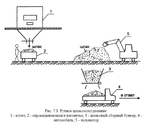 Ручное шлакозолоудалениеРучное шлакозолоудаление применяют только в теплогенерирующих установках небольшой мощности, где используются котлы малой производительности. Это связано с тем, что все операции производятся с использованием физической силы обслуживающего персонала: удаление шлака из котла, загрузка его в узкоколейные вагонетки с опрокидывающимся кузовом или другие транспортирующие устройства (тачки и т.п.), передвижение по путям, выгрузка в шлаковый сборный бункер. Система ручного шлакозолоудаления условно показана на рис. 7.3. ![]() Шлак из котла 1 обычно удаляется вручную и загружается в вагонетки 2. В них он транспортируется опять же вручную из котельной на золохранилище, которое расположено на территории теплогенерирующей установки, или ссыпается в шлаковый сборный бункер 3. Из шлакового сборного бункера зола и шлак вывозятся на автомобилях 4 или других автотранспортных средствах в золоотвал или используются для строительно-хозяйственных нужд. Данный способ шлакозолоудаления, когда для удаления и транспортировки шлака и золы не используется вода и они удаляются в сухом состоянии, называют сухим. Следует отметить, что при слоевом сжигании угля и сухом шлакозолоудалении зола и шлак являются ценными строительными материалами и могут быть использованы в строительных и хозяйственных целях. ![]() К достоинствам ручного способа шлакозолоудаления следует отнести: - простоту и небольшие капитальные затраты; - использование шлака в строительно-хозяйственных целях. Недостатками данного способа шлакозолоудаления являются: - тяжелый физический труд обслуживающего персонала; - плохие санитарно-гигиенические условия работы; - малая производительность по удаляемому шлаку и зависимость ее от физического состояния обслуживающего персонала; - значительные расходы на заработную плату обслуживающего персонала. Все вышеперечисленные недостатки данного способа шлакозолоудаления приводят к тому, что этот способ в настоящее время применяется только в небольших котельных с котлами малой мощности, расположенных в отдаленных районных пунктах, где трудно обеспечить по разным причинам автоматизацию и механизацию процесса сжигания твердого топлива в топках котлов. |