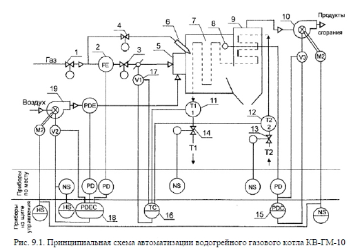 Системы автоматизации котловВ теплогенерирующих установках в настоящее время применяют различные схемы и системы автоматизации основных технологических процессов; некоторые из них перечислены ниже. Автоматизация процесса горения в топочной камере. При такой автоматизации подача топлива и воздуха в топочную камеру зависит от требуемых параметров пара или горячей воды, которые должны быть направлены потребителю. Одновременно с регулировкой подачи в топочную камеру топлива и воздуха регулируется работа дымососа, служащего для поддержания необходимого разрежения в топочной камере и газовом тракте котла. Таким образом, в систему автоматического регулирования процесса горения входят регуляторы давления и разрежения, соотношения "топливо-воздух" и др. Автоматизация питания котла водой. Для питания парового котла водой и обеспечения необходимого уровня воды в заданных пределах в барабане котла необходимо поддерживать требуемое соотношение между количеством подаваемой в котел воды, количеством образующегося пара и количеством удаляемой из котла продувочной воды. Для этого используются датчики уровня воды в барабане котла и регуляторы питания, воздействующие на количество подаваемой питательными насосами воды. Автоматическое регулирование непрерывной продувки. Для поддержания постоянного солесодержания котловой воды в водотрубной системе котла необходимо часть солесодержащей воды непрерывно удалять из барабана котла и заменять ее чистой питательной водой. Для такой регулировки обычно используются датчики-солемеры котловой воды и регуляторы непрерывной продувки. В настоящее время разработано значительное число разнообразных систем автоматизации теплогенерирующих установок, которые описаны в литературе. Перечислить и пояснить все их в данном пособии не представляется возможным, поэтому ниже для примера рассмотрена работа системы автоматизации водогрейного котла КВ-ГМ-10, работающего на газе. Принципиальная схема автоматизации котла показана на рис. 9.1. Целью автоматического регулирования технологического процесса получения горячей воды в водогрейном котле для нужд отопления в данном случае является поддержание на заданном уровне температуры воды на выходе из котла в зависимости от изменяющейся температуры наружного воздуха. Непрерывная циркуляция с постоянным расходом сетевой воды через котел при такой системе регулирования позволяет отказаться от системы автоматики по расходу воды. Рассмотрим более подробно работу автоматизации котла на примере схемы, показанной на рис. 9.1. Процесс получения горячей воды с заданной температурой и постоянным расходом происходит следующим образом. Центробежными сетевыми насосами непрерывно по магистрали Т2 подают воду через автоматическую задвижку 13 в котел. Вода, проходя через конвективные и экранные поверхности котла, которые находятся в конвективной шахте 9 и топочной камере 7, нагревается. После котла вода с заданной температурой направляется через автоматическую задвижку 14 в подающую магистраль Т1. Температура воды в подающей Т1 и обратной Т2 магистралях измеряется с помощью датчиков 11 и 12, сигнал от которых передается на терморегулятор 16, который при необходимости подает сигнал на исполнительный механизм регулирующего органа 17, увеличивая или умен
