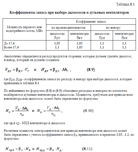 Выбор тягодутьевого оборудованияВыбор тягодутьевого оборудования теплогенерирующей установки (дутьевого вентилятора и дымососа) производят после определения всех объемов перемещаемых по газовоздушному тракту котла воздуха и продуктов сгорания и определения полных аэродинамических сопротивлений воздушного и газового трактов. Подбор дутьевого вентилятора осуществляют по расчетным производительности VB.P и полному напору HB.P, которые вентилятор должен обеспечить. Эти величины рассчитываются по формулам ![]() ![]() Электродвигатель для установки на привод вентилятора или дымососа подбирается по мощностям Аэд.В или Аэдд из перечня двигателей, рекомендуемых заводом- изготовителем тягодутьевых машин. |