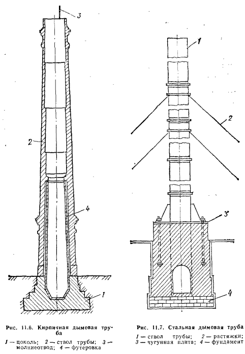 ДЫМОВЫЕ ТРУБЫДымовые трубы работают в сложных условиях: при перепадах температуры, давления, влажности, агрессивном воздействии дымовых газов, ветровых нагрузках и нагрузках от собственной массы. Дымовые трубы выполняют кирпичными, железобетонными и металлическими. На рис. 11.6 показана кирпичная дымовая труба. Основными элементами дымовой трубы являются: фундамент трубы 1 (цоколь) и ствол 2. Кладка последнего состоит из отдельных звеньев высотой 5—7 м различной толщины. уменьшающейся постепенно кверху. Минимальная толщина стенок верхнего звена трубы 180—250 мм. Для придания устойчивости снаружи труба имеет форму усеченного конуса (с конусностью 0,02—0,03). Для предохранения кирпичной кладки трубы от действия горячих газов нижнюю часть трубы обкладывают футеровкой 4 из огнеупорного кирпича, оставляя небольшой зазор между основной кладкой и футеровкой для свободного расширения последней. В цоколе предусматривают, как правило, не более двух вводов для боровов (дымоходов). При введении в дымовую трубу нескольких боровов внутри выкладывают направляющие перегородки (рассечки).. В боровах и у основания дымовой трубы предусмотрены отверстия — лазы для удаления золы. Кирпичные трубы сооружают высотой 30—70 м, диаметром не менее 600 мм. ![]() Железобетонные трубы, футерованные по всей высоте, выполненные от 80 до 200 м и применяют обычно для котельных агрегатов большой мощности. Кирпичные и железобетонные трубы большой высоты имеют высокую стоимость при их сооружении, поэтому одну трубу ставят для нескольких котельных агрегатов. Металлические дымовые трубы (рис. 11.7) изготовляют из стальных листов толщиной от 3 до 15 мм. Труба состоит нз отдельных звеньев, соединенных между собой сварными швами. Ствол трубы 1 установлен на чугунной плите 3. Устойчивость трубы достигается с помощью растяжек 2 из круглой стали диаметром 5—7 мм, прикрепленных к кольцам. Растяжки укрепляют на высоте 2/з трубы. Стальные трубы сооружают высотой не более 30—40 м. Согласно санитарно-техническим нормам, сооружение дымовой трубы высотой 30 м допускается при суточном расходе многозольного топлива до 5 т/ч. Срок службы стальных труб до 10 лет, и он значительно сокращается при сжигании высокосернистых топлив. Быстрый износ труб до 3—4 лет происходит вследствие коррозии, и в этом случае их не следует применять. При расчете естественной тяги определяют высоту и диаметр дымовой трубы. Если высота трубы задана, то рассчитывают диаметр трубы и величину суммарных сопротивлений газового тракта от топки до трубы, которые могут быть преодолены за счет естественной тяги. Диаметр трубы при естественной тяге определяют исходя из суммарного количества газов, покидающих котельные агрегаты, подключенные к трубе, и скорости газов на выходе из нее. Последнюю выбирают равной не менее 4 м/с во избежание задувания трубы (обычно эта скорость wr лежит в пределах 6—10 м/с). |