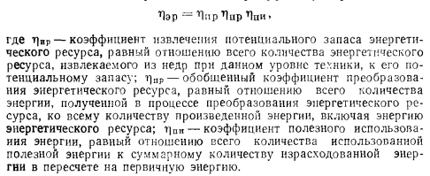 ЭФФЕКТИВНОСТЬ ИСПОЛЬЗОВАНИЯ ЭНЕРГЕТИЧЕСКИХ РЕСУРСОВ, ПУТИ ЕЕ ПОВЫШЕНИЯ. ПОБОЧНЫЕ (ВТОРИЧНЫЕ) ЭНЕРГЕТИЧЕСКИЕ РЕСУРСЫЭффективность использования энергетических ресурсов определяется степенью преобразования их энергетического потенциала в конечную продукцию или в конечные виды энергии, полезно используемые для нужд народного хозяйства или населения (например, в механическую энергию движения, в теплоту, обеспечивающую необходимые условия в помещении, и др.). Уровень использования энергетических ресурсов зависит от степени извлечения их при добыче; сохранения добытого топлива при его первичной переработке (например, обогащении), транспортировании и хранении; от степени преобразования добытых первичных энергетических ресурсов в нужный вид энергии (тепловую, механическую, электрическую п др.), а также от степени полезного использования конечного вида энергии. При этом если полнота извлечения энергетических ресурсов при добыче, сохранение добытого топлива при его первичной переработке, складировании и транспортировании определяются в основном технологическим совершенством применяемых средств, то степень преобразования первичных энергоресурсов в другие виды энергии н особенно уровень полезного использования конечного вида энергии определяются не только применяемыми при этом средствами и процессами, но и эффективностью термодинамических циклов, лежащих в основе технологических схем преобразования энергии. Полную эффективность использования энергетических ресурсов можно оценить по коэффициенту полезного использования энергетического ресурса гэр, равного: ![]() Традиционные процессы технологии добычи, переработки и использования энергетических ресурсов основываются на том, что энергетические ресурсы всегда могут быть легко добыты с небольшими затратами труда. Это, а также уровень развития техники явились причиной сохранения достаточно низких значений коэффициента извлечения топлива, который для месторождений нефти не превышает 30—40 %, газа — 80 %, угля — 40 % и ниже. Выработка дешевых месторождений топлива и необходимость разработки новых труднодоступных его запасов, а также связанное с этим повышение стоимости добычи в настоящее время привели к необходимости внедрения новых технологий добычи топлива с целью повышения степени его извлечения из недр. Повышение степени извлечения нефти до 40—45% возможно путем закачивания в нефтяной пласт водяного пара, газов с высокой температурой, химических реагентов, понижающих вязкость нефти, а газа — путем применения жидкостей, вытесняющих газ, и др. Так, при преобразовании химической энергии органического топлива в тепловую путем его сжигания эффективность преобразования будет определяться полнотой сжигания топлива и тепловыми потерями в окружающую среду от ограждающих конструкций устройства, в котором это преобразование производится. Современные топочные устройства позволяют обеспечить степень такого преобразования, равную 97—99 % в крупных энергетических установках и 95— 97 % в установках малой мощности. Преобразование же тепловой энергии продуктов сгорания в тепловую энергию рабочего тела (теплоносителя — водяного пара, горячей воды и др.) электростанций и систем теплоснабжения в поверхностях рекуперативных теплообменников (паровых и водогрейных теп