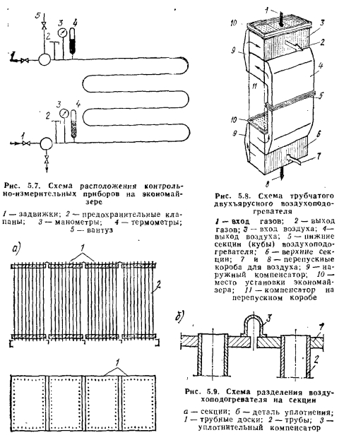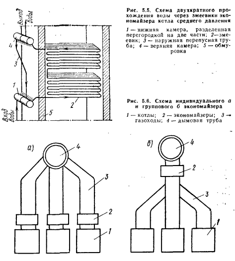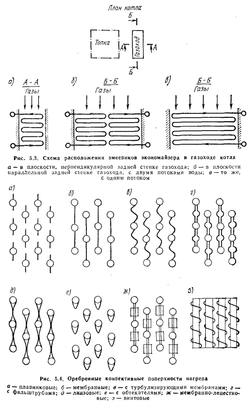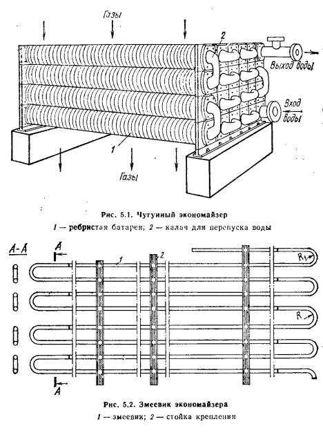 ЭКОНОМАЙЗЕРЫЭкономайзеры выполняют в виде трех конструкций: чугунные, стальные гладкотрубные и стальные из оребренных труб. В чугунных экономайзерах (рис. 5.1) поверхность нагрева образована чаще всего из оребренных чугунных труб, соединенных в змеевики путем гладко- трубных U-образных калачей для перепуска воды. Обычно калачи выносятся из зоны непосредственного обогрева продуктами сгорания за обмуровку. Это облегчает ремонт экономайзера и повышает надежность его работы, позволяя устранять в случае необходимости протечки в уплотнениях без разборки тепловой изоляции котла. Для улучшения теплопередачи в экономайзерах применяют противоток воды и газов. Стремление увеличить поверхность нагрева чугунного экономайзера при той же массе или сократить массу при той же поверхности по сравнению с гладкотрубным привело к применению ребристых экономайзеров, состоящих из чугунных труб с круглыми или прямоугольными ребрами. Такие экономайзеры оказываются более компактными, прочность их возрастает, и они могут работать при повышенном до 2,3 МПа давлении. Однако вследствие ребристой поверхности они более чувствительны к внешнему загрязнению. Занос золой становится опасным, так как очистка скребками невозможна. Ребристые экономайзеры очищают обдувкой паром или воздухом. Обдувку следует производить регулярно, так как загрязнение золой, затвердевшей между ребрами, часто уже не может быть устранено без порчи самого экономайзера (поломки ребра). ![]() В стальных гладкотрубных экономайзерах поверхность нагрева выполнена из гладких стальных труб, согнутых в виде змеевиков (рис. 5.2). В большинстве случаев применяют плоские змеевики с простым гибом, у которых гнутые и прямые участки труб находятся в одной плоскости. Змеевик состоит из нескольких сваренных кусков труб. При этом места сварки стремятся приблизить к обмуровке газохода, чтобы облегчить ремонт сварных соединений. Поверхность нагрева экономайзера выполняют из параллельно включенных трубчатых змеевиков с небольшим внутренним диаметром, которые, как правило, располагаются в шахматном порядке. Входные и выходные концы змеевиков объединяются соответственно входными (распределяющими) и выходными (собирающими) коллекторами, расположенными на стенках конвективного газохода. Нагретая вода из коллекторов обычно отводится трубами большого диаметра, равномерно распределенными по длине коллектора. Трубы экономайзера укреплены на стойках, установленных на опорных балках коробчатой формы. Опорные балки, прикрепленные к каркасу, изолированы, и в ряде случаев их охлаждают воздухом, присоединяя к напорной стороне дутьевого вентилятора. По ходу газов экономайзер разбит на пакеты высотой 1—1,5 м, что улучшает условия ремонта, хотя и требует значительного увеличения высоты конвективной шахты. Трубы к коллектору присоединяют сваркой непосредственно или через промежуточные штуцера, которые также приварены к коллектору. Плоскость змеевиков может быть расположена параллельно или перпендикулярно задней стенке газохода (рис. 5.3). Схему расположения змеевиков выбирают из условия обеспечения требуемой скорости воды. При одинаковых размерах газохода, шаге и диаметре труб наибольшее количество змеевиков будет в схеме на рис. 5.3, а, наименьшее — в схеме на рис. 5.3, а. В связи с необходимост