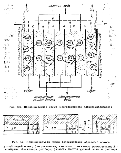 ЭлектродиализЭлектродиализ—ионообменный процесс, отличающийся тем, что ионный слой заменен ионитными мембранами, получаемыми полимеризацией смеси реагентов. Для повышения механической прочности мембраны обычно формируют на упрочняющих металлических сетках. Обычно этот метод используют для опреснения соленых вод под действием постоянного электрического тока с помощью специальных мембран (пористых пленок), обладающих способностью пропускать соответственно только катионы или анионы. Принципиальная схема такой установки для удаления поваренной соли показана на рис. 8.6. Аппарат состоит из ряда камер, разделенных чередующимися катионопроницаемыми К и анионопроницаемыми А мембранами. Под действием электрического поля ионы Na+ и С1~ устремляются к соответствующим электродам. Ионитные мембраны в присутствии воды ионизированы и приобретают соответствующие заряды: отрицательные — в катионитных и положительные — в анионитных мембранах. Во всех нечетных камерах положительно заряженные катионы при движении к катоду встречают на своем пути отрицательно заряженные, т. е. катионопроницаемые мембраны, и поэтому проходят сквозь них в соседние четные камеры аппарата. Аналогичным образом в эти же камеры нз нечетных камер через положительно заряженные (т. е. анионопроницаемые мембраны) проникают анионы растворенных солей. Попавшие в четные камеры ионы остаются в этих камерах, так как здесь они встречаются с одноименно заряженными мембранами (катионы — с положительными, анионы — с отрицательными) и при приближении к ним отталкиваются от них. Таким образом, во всех нечетных камерах вода обессоливается, а в смежных — четных камерах с противоположно ориентированными мембранами — превращается в рассол вследствие накопления ионов солей, поступающих из соседних нечетных камер. В настоящее время существуют электродиализные установки (ЭДУ) различной производительности — от 50 до 1000 м3 воды в сутки, с удельным расходом электроэнергии — 2,5 кВт-ч/м3 при степени очистки воды от 60— 85 % снижения содержания соли. В последние годы все более широкое применение для очистки воды от солей находит ультрафильтрация. Этот способ заключается в про- давливании воды через пористый материал, размеры пор которого меньше размера задерживаемых частиц загрязнителя. ![]() |
