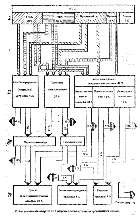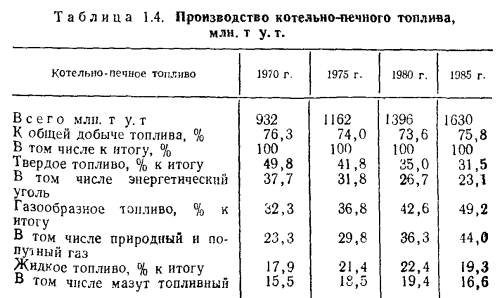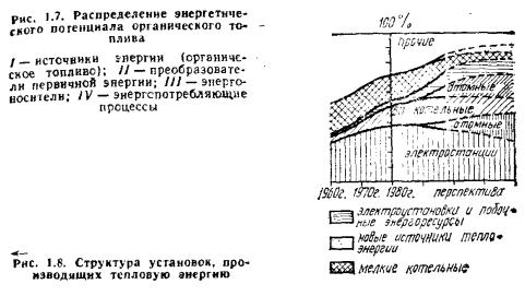 Энергетический баланс СССРВ развитии любой страны определяющим является ее обеспеченность энергоресурсами. Наша страна является единственной крупной промышленно развитой страной, которая полностью обеспечивает себя топливом и энергией за счет собственных ресурсов и экспортирует топливо и электроэнергию в значительных объемах. За период с 1945 по 1980 г. добыча органического топлива, являющегося основой развития энергетики страны, возросла в 10,2 раза со средним приростом 46 млн. т у. т. в год (рис. 1.5). При увеличении численности населения со 177 до 265 млн. человек за этот период удельное потребление только органического топлива на человека увеличилось с 1 До 7,2 т у. т. (т. е. в 7,2 раза). Условно весь период развития страны можно разбить на три этапа: первый (до 1950 г.) —этап ориентации народного хозяйства на твердое топливо; второй (с 1950 до 1990 г.) —этап быстрого роста потребления и добычи Нефти и газа и третий (за пределами 1990 г.)—этап повышения в энергетическом балансе страны доли потребления угля и ядерного топлива (рис. 1.6). Развитие первого этапа характеризуется относительно высокими темпами роста добычи угля и нефти (рис. 1.5) и в то же время достаточно быстрым снижением (с 62 до 25%) доли древесины в энергетическом балансе страны. Началом второго этапа было резкое увеличение темпов добычи сначала нефти, а начиная с 1955 г. — и природного газа. Этот период характеризуется перестройкой энергетики, в том числе и систем теплоснабжения, с ориентацией на жидкое и газообразное топливо и снижением темпов роста добычи угля; так что к 1980 г. доля газа и нефти в энергетическом балансе страны возросла до 62%, а угля упала до 27%. Третий этап развития энергетики страны будет характеризоваться интенсивным развитием ядерной энергетики и ощутимым ее влиянием на структуру энергетического баланса (см. рис. 1.6). Этот этап развития энергетики и в значительной степени народного хозяйства в целом определяется Энергетической программой СССР, основные положения которой были подтверждены на XXVII съезде КПСС. Энергетическая программа СССР исходит из перспектив развития экономики СССР до 2000 г. и определяет научно обоснованные принципы, главные направления и важнейшие мероприятия по расширению и совершенствованию энергетической базы страны. Основные положения Энергетической программы СССР предусматривают: проведение активной энергосберегающей политики во всех звеньях народного хозяйства и в быту с целью значительного снижения удельной энергоемкости национального дохода; развитие всех отраслей топливной промышленности с обеспечением преимущественного роста добычи газа, угля открытым способом и форсированием развития атомной энергетики; экономически оправданное комплексное освоение гидроэнергетических ресурсов Сибири, Дальнего Востока и Средней Азии; создание технической и материальной базы для широкого использования атомных реакторов на быстрых нейтронах и нетрадиционных возобновляющихся источников энергии, солнечной, геотермальной, приливной, ветровой и энергии биомассы. Программа предусматривает также необходимость повышения надежности энергетических систем и обеспечение в необходимых количествах экспортирования топлива и электроэнергии, в том числе в страны — члены СЭВ. Выполнение Энергетической программы рассчитано на два этапа: первый эта