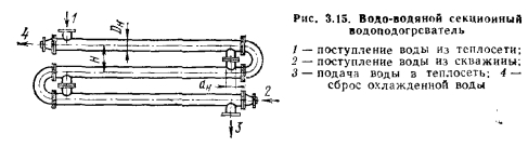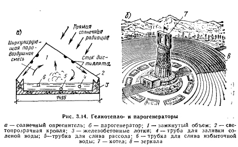 ПАРО- И ТЕПЛОГЕНЕРАТОРЫ ГЕЛИО- И ГЕОТЕРМАЛЬНЫХ УСТАНОВОКВ настоящее время солнечные теплогенераторы получили широкое применение для установки опреснения воды (рис. 3.14), водоподъемных и сушильных установок, для обогрева теплиц и зданий в южных районах страны. В общем виде задача получения теплоты солнечной энергии и преобразования ее в пар или высокопотенциальную тепловую энергию (115—150°С) решена, однако на пути ее серийной реализации имеется ряд технических трудностей. Первый относительно крупный парогенератор, вырабатывающий около 14 кг/с пара с давлением 3 МПа и температурой 400 °С, сдан в эксплуатацию в 1985 г. ![]() Простейшие гелиоустановки имеют, как правило, три основные части: солнечную панель для поглощения солнечной энергии, теплообменники, теплонакопитель. В южных районах нашей страны производительность такого типа водонагревателей на 1 м2 площади застекления в летний день достигает 60—70 л воды, нагретой до 55—60 °С. Схема водопойного пункта, выполненного по проекту института Гипроводхоз в соответствии с рекомендациями Физико-технического института АН ТССР Для условий Кара-Кумской пустыни, обеспечивающей водопой отары овец 1000 голов, показана на рис. 3.14. Секция солнечного опреснителя (теплогенератора) состоит из двух основных частей: железобетонных лотков 3 (см. рис. 3.14, а) и светопрозрачной кровли 2, которые герметично соединены между собой и образуют замкнутый объем 1. Все железобетонные элементы изготовляются серийно на специализированных заводах ЖБИ. Через трубку 4 заливают в секцию соленую воду, подлежащую опреснению. Со второго более низкого торца трубка 6 служит для слива избыточной воды, поступающей при заливке, а трубка 5—-для слива рассола. Дно бассейна посыпано ровным слоем песка толщиной 10—15 мм фля предотвращения адгезии выпавших на дно солей, облегчения их очистки к уменьшения коррозии бетона. ![]() В центре площадки на башне высотой 40 м установлен трубчатый котел 1 (см. рис. 3.14,6), который может вращаться и изменять угол наклона вслед за видимым вращением солнца и направлением отраженных его лучей от подвижных зеркал 2, расположенных на двадцати трех концентрически расположенных железнодорожных путях. Каждый движущийся отражатель размером 3x5 м состоит из 30 отдельных зеркал. Сложная система автоматики разработана с таким расчетом, чтобы вся система движущихся отражателей в каждый момент времени улавливала максимальное количество лучистой энергии. Котел представляет собой плоский экран из вертикальных труб, в центре которого расположен парогенератор с пароперегревателем, размещенным вокруг него. Периферийные, менее интенсивно обогреваемые области служат экономайзером. Геотермальные воды наиболее целесообразно применять для теплоснабжения производственных, жилых, общественных и сельскохозяйственных зданий и сооружений. При использовании геотермальных вод с невысоким солесодержанием не требуется установки тепло- или парогенераторов, так как вода, пройдя систему очистки, непосредственно направляется в систему теплоснабжения. В случае использования высокомниерализованной воды вследствие сложности и высокой стоимости необходимой химводоочистки применяют закрытую схему, в которой тепло геотермальных вод используют для нагрева в промежуточном теплообменнике (теплогенераторе) химочищенной вод