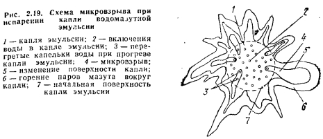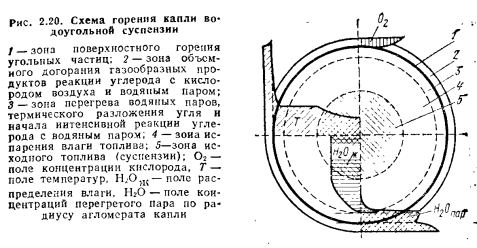 Горение композиционных топливКомпозиционными топливами являются водомазутные эмульсии, мазутоугольные и водомазутоугольные суспензии, водоугольные суспензии, угольные гранулы и брикеты. Горение водомазутных эмульсий. Водомазутная эмульсия, содержащая до 10—15 % (иногда до 30—50 %) воды, вводится в топочный объем аналогично мазуту, в распыленном подогретом состоянии. При одном и том же расходе мазута (для обеспечения заданной теплопроизводительности) применение водомазутной эмульсии с содержанием некоторого количества воды приводит к увеличению удельного количества образующихся при распыливании топлива капель в единице объема топочного пространства и как следствие — к увеличению удельной поверхности реагирования (т. е. к увеличению суммарной скорости выгорания топлива). Введение в объем капель мазута мелких капель воды (размером менее 0,007 мм) вследствие большей разности температур испарения воды и мазута приводит при нагреве капли топлива к перегреву воды, внутри капли, повышению в капельках воды давления, прорыву испаряющейся воды сквозь слой мазута во вне объема капли топлива, увлечению за собой части топлива и искривлению в связи с этим внешней поверхности капли эмульсии. Этот процесс называется явлением микровзрыва. Искривление поверхности капли столь сильно, что существенно увеличивает удельную поверхность реагирования топлива и как следствие увеличивает суммарную скорость его выгорания (рис. 2.19). Присутствие в капле топлива воды, на нагрев и перегрев которой затрачивается определенное количество теплоты, способствует возникновению поля температур внутри капли топлива от центра к ее периферии, что тормозит прогрев внутренних областей капли и способствует сдерживанию процессов пиролиза и коксования мазута (т. е. уменьшению образования твердых углеродных соединений — сажи и кокса, сопровождающих эти процессы). Вода, испаряющаяся из капли топлива, диффундирует сначала в паровую зону продуктов разложения мазута, располагающуюся вокруг поверхности капли, и далее через зону горения — в окружгющую каплю среду. Повышенная концентрация в связи с этим водяных паров в зоне горения способствует более полному догоранию оксида углерода и углеводородных газов, уменьшает температуру на поверхности зоны горения и в факеле в целом, что приводит к уменьшению образования вредных выбросов. Таким образом, введение воды в мазут с образованием водомазутной эмульсии повышает скорость горения этого топлива, уменьшает сажеобразование при горении, уменьшает образование окислов азота и их выброс с продуктами сгорания, улучшает условия эксплуатации оборудования. ![]() Однако введение воды в топливо требует дополнительных затрат на ее испарение в количестве 24,62 кДж энергии на 1 % влажности топлива. При 15 % влажности это составляет 369 кДж на 35 200 кДж/кг этого топлива, что соответствует дополнительному увеличению на --1,05 % расхода этого топлива, что ниже потерь топлива с механической и химической неполнотой сгорания, обычно имеющих место при сжигании мазута, особенно если он обводнен, за счет разогрева его острым паром, что часто имеет место. При использовании водомазутной эмульсии с И7Г15% в паровых котлах КПД котлов увеличивается по сравнению с сжиганием в них мазута. Горение водоугольных суспензий. Водоугольные суспензии содер