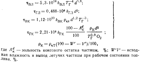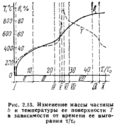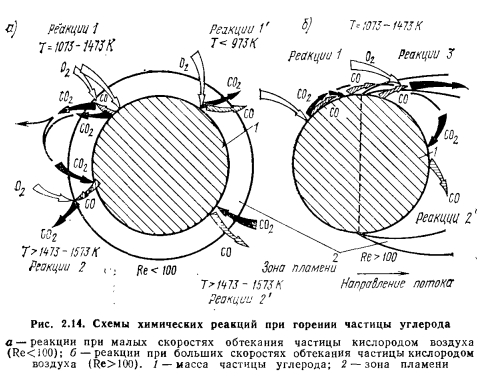 Горение твердого топливаТвердое топливо является термически нестойким органическим веществом, процесс горения которого протекает через ряд стадий. Основной стадией, определяющей интенсивность всего процесса в целом, является стадия горения так называемого коксового остатка — углерода, оставшегося в частице топлива после завершения деструкции вещества исходного топлива и выхода летучих веществ. В основе процесса горения частиц углерода лежат гетерогенные химические реакции взаимодействия углерода с окружающими горящую частицу газами: 02, Н20, С02 и др. Наиболее глубокие исследования горения углерода проведены в СССР А. С. Предводителевым, Л. Н. Хитриным, Г. Ф. Кнорре, Б. В. Канторовичем и др. В основе процесса горения частицы углерода, движущейся в потоке воздуха, лежит модель, предложенная Л. Н. Хитриным, согласно которой угольные частицы малых размеров приобретают скорость, близкую к скоростям движения потока воздуха. При таком условии вынужденный конвективный перенос массы отсутствует и частица выгорает равномерно. При этом возможны четыре режима взаимодействия углерода с кислородом воздуха в зависимости от температуры среды (рис. 2.14). Основными реакциями в модели считаются реакции углерода с кислородом, поступающим к поверхности частицы за счет диффузии из основного потока с образованием оксида и диоксида углерода. Продукты сгорания диффундируют от поверхности частицы в окружающее ее пространство. При невысоких температурах (973 К) (реакция 1) реакции окисления углерода протекают с образованием СО и СОг. При более высоких температурах (1070—1470 К) возможна вторичная реакция догорания образовавшегося СО вблизи поверхности частицы так, что в окружающую среду будет отводиться только или преимущественно диоксид углерода (СОг) (реакция 1). При этом часть образовавшегося СОг может при Т = = 1473—1573 К вновь продиффундировать к поверхности углерода и вступить с ним в эндотермическую реакцию с образованием оксида углерода (реакция 2), который затем догорит в результате взаимодействия с кислородом в зоне пламени вокруг частицы. ![]() При высоких температурах (выше 1470—1570 К), как правило, кислород не достигает поверхности частицы и процесс горения протекает по гетерогенной реакции С+ +С02 = 2С0 С последующим догоранием СО на некотором расстоянии от поверхности в зоне пламени (реакция 2). В случае омывания частицы потоком окислителя с большой скоростью (Re>100) с лобовой стороны частицы будут протекать только гетерогенные реакции (реакции 1 и 2, рис. 2.14,6); догорание же оксида углерода будет наблюдаться в кормовой части потока на границе циркуляционной зоны (реакция 3, рис. 2.14,6), а вторичные реакции C-f-C02 будут иметь место главным образом в тыльной части углеродной частицы (схема 2, рис. 2.14,6), где кислород отсутствует, но имеются хорошие тепловые условия для обеспечения эндотермических реакций. Важной отличительной особенностью горения коксового (углеродного) остатка частицы твердого топлива является его высокая пористость, что обеспечивает диффузию внутрь углеродной частицы активных по отношению к углероду газов (С02, 02, Н20). Л. Н. Хитрин оценивает величину удельной внутренней поверхности частицы, приходящейся на единицу ее объема, для древесного угля от 57 до 114 см2/см3, для электродного угля от 70 до 500 и для антрацита около 1000 см2/см3. В ходе реагиро