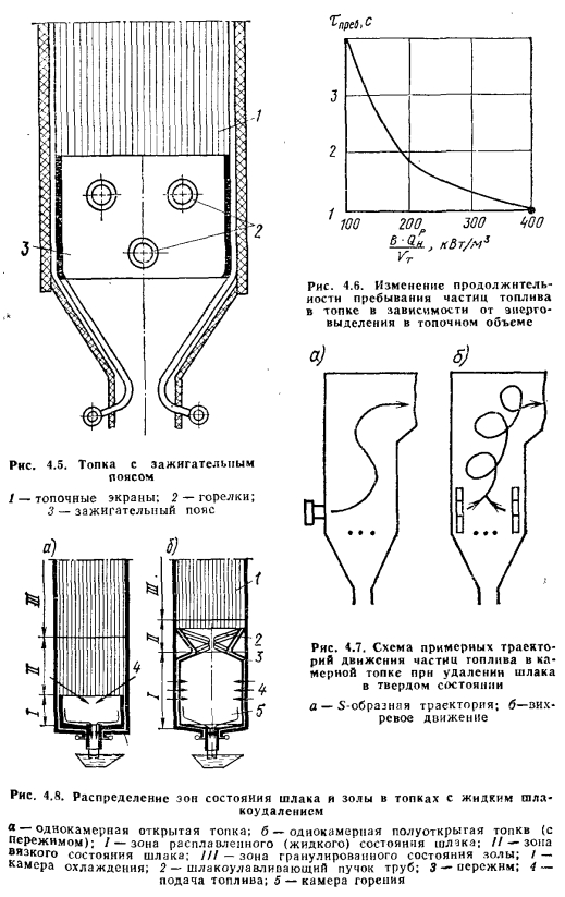 Камерные топки с удалением шлака в твердом состоянииКамерные топки с удалением шлака в твердом состоянии обычно представляет собой вертикальную прямоугольную шахту, заканчивающуюся внизу холодной воронкой. Такие топки получили название открытых топок. Продукты сгорания охлаждаются топочными экранами, состоящими главным образом из парогенерирующих, частично пароперегревательных и экономайзерных поверхностей нагрева. Топочные экраны защищают также обмуровку от воздействия высокой температуры. Горючая смесь образуется в топке непосредственно на выходе из горелок. Совершенство смесеобразования оказывает решающее влияние на экономичность и надежность работы парогенератора. Хорошее смесеобразование способствует эффективному сжиганию топлива при малом избытке воздуха (ат = 1,2-f-1,25). Ввиду низкой температуры первичного воздуха поступление его в топку ограничивают (особенно для топлива с малым выходом летучих), это уменьшает его охлаждающее действие: на 20—25 % для АШ; 25—35 % для каменных и на 45—55 % для бурых углей. При сжигании топлива с малым выходом летучих (АШ, Т) для поддержания высокой температуры в зоне воспламенения часть поверхности нагрева экранов, вдоль которых движутся топочные газы к корню факела, покрывают огнеупорным слоем — зажигательным поясом (рис. 4.5). Эффективное сжигание пылевидного топлива происходит при воспламенении всех пылинок в сравнительно малом объеме зоны воспламенения. Чем меньше пылинок пройдет через эту зону не воспламенившись, тем выше полнота сгорания топлива и тем меньше механическая неполнота сгорания топлива (для бурых и каменных углей 4=0,5—1,5 %; для АШ 4=6 %). Поступающее в топку пылевидное топливо характеризуется различным фракционным составом. Содержащиеся в небольшом количестве крупные фракции пыли сгорают при большей длительности пребывания в топке, они догорают в верхней половине топки. Объем топочной камеры должен обеспечить полное сгорание наиболее крупных фракций пыли, чему соответствует допустимое энерговыделение в топочной камере. Продолжительность пребывания топлива зависит от энерговыделения; чем оно больше, тем быстрее сгорает топливо (рис. 4.6). При одинаковом фракционном составе топливной пыли длина пути ее частиц не оказывает большого влияния на полноту сгорания. Основное значение имеет длительность пребывания их в топке. На схемах (рис. 4.7) путь движения частиц топлива резко различен, но так как тепловое напряжение топочного объема при неизменном расходе топлива остается постоянным (BQ/VT), то и время пребывания частиц топлива также остается постоянным (тпреб== const). При этом скорость движения частиц различна и обратно пропорциональна длине пути. ![]() Допустимое энерговыделение в топочном объеме зависит от рода топлива и метода его сжигания. Топливо с большим выходом летучих быстрее воспламеняется, а выделяющиеся при его горении летучие вещества увеличивают пористость коксового остатка, в связи с чем облегчается диффузия кислорода в глубь кокса и ускоряется процесс его выгорания. Чем больше выход летучих, тем быстрее сгорает топливо и тем более высоким может быть допустимое тепловое напряжение топочного объема. Пылеугольные топки с удалением шлака в твердом состоянии обычно применяют для сжигания топлива с большим и умеренным выходом летучих при тугоплавкой з