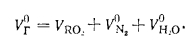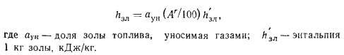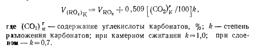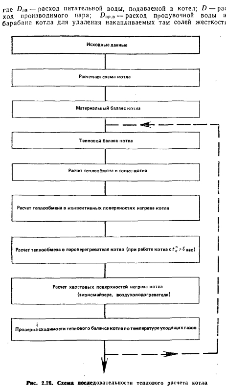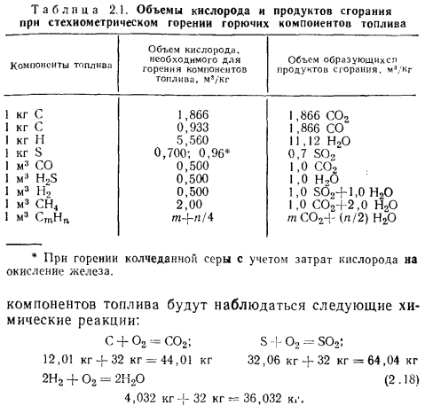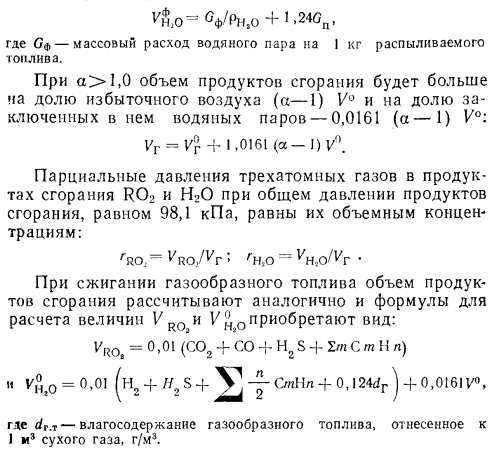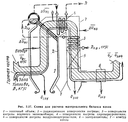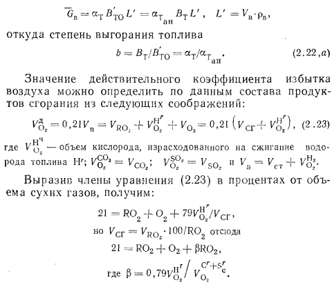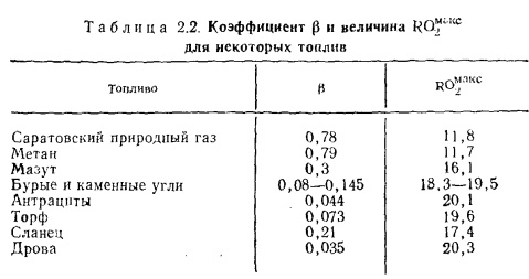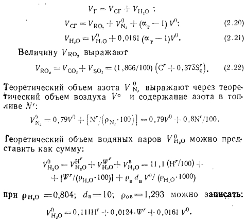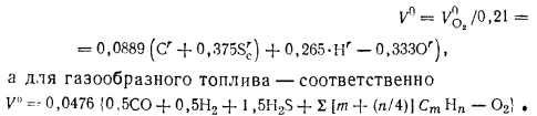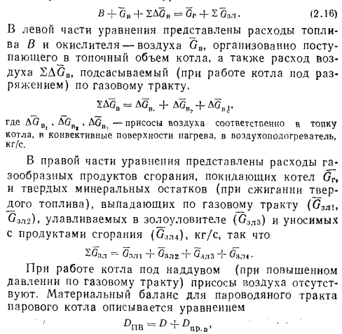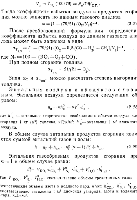 Материальный баланс котлаМатериальный баланс котла в целом составляют для его газовоздушного и пароводяного трактов (для случая парового котла) (рис. 2.27). Материальный баланс процессов преобразования химической энергии топлива в тепловую продуктов сгорания описывается уравнением ![]() ![]() ![]() Расчет материального баланса для газовоздушного тракта котла проводят на 1 кг сжигаемого топлива и в объемных расходах газа; уравнение (2.16) в этом случае преобразуется: ![]() При расчете объема воздуха V, необходимого для сгорания 1 кг топлива, нужно знать расход кислорода для обеспечения химических реакций горения, состав которого задается в процентах от 1 кг рабочего состояния жидкого или твердого топлива: ![]() или его составляющих в процентах от 1 м3 в случае газообразного топлива. При полном окислении горючих компонентов топлива будут наблюдаться следующие химические реакции: ![]() Объем кислорода, необходимого для обеспечения выгорания горючих компонентов топлива, и объемы образующися при этом продуктов сгорания приведены в табл. 2.1. Плотности газов при нормальных условиях составляют для: Оо— 1,4289; Н20 —0,804; С02— 1,9768; В 1 м3 воздуха содержится 21 % О2, поэтому теоретический объем воздуха V°, необходимый для полного сгорания 1 кг (1 м3) для твердого и жидкого топлива, составит: ![]() Для обеспечения полного сжигания топлива в топочном объеме в него вводят воздуха больше, чем требуется по химической реакции (KB>V°). Дополнительное количество вводимого воздуха оценивают коэффициентом избытка воздуха ат, который равен отношению количества воздуха, введенного в топочный объем, к теоретически необходимому для полного сгорания 1 кг (1 м3) топлива: ![]() Коэффициент избытка воздуха зависит от вида сжигаемого топлива, его качества, условий и параметров топливоподготовки, метода сжигания топлива и конструкции топочного устройства. Коэффициент выбирают из условий обеспечения получения максимального КПД котла при допустимых выбросах окислов азота. При слоевом сжигании величина ат равна 1,3—1,6; при камерном сжигании угля — 1,2—1,25; при сжигании газа п мазута— 1,05—1,1. В котлах, работающих под разрежением, в связи с присосами воздуха по ходу газового тракта коэффициент а увеличивается, и на выходе из котла величина аух>ат; аУх = ат42Аа. Приращение общего коэффициента избытка ЕДа определяют суммированием присосов воздуха по каждому элементу котла по ходу газов. Обычно 2Да = 040,2. Объем и состав продуктов сгорания. Продукты сгорания топлива содержат продукты полного сгорания горючих компонентов топлива: диоксид углерода; водяной пар и диоксид серы, а также водяной пар, привнесенный с влагой воздуха и образовавшийся в результате испарения влаги топлива; азот воздуха и азот, образовавшийся из азотистых соединений топлива; избыточное количество воздуха, введенного в топочный объем и не участвующего в горении, и, наконец, еще некоторое количество водяного пара в случае, если он использовался для распыления топлива. При неполном сгорании топлива в продуктах сгорания возможно присутствие оксида углерода, водорода, метана и непредельных углеводородов, концентрацию которых определяют анализом продуктов сгорания. Обычно содержание этих веществ не превышает 0,5—1,0%, и в расчетах объема продуктов сгорания их не учитывают. Потери же энергетического потенциала топлива за счет е