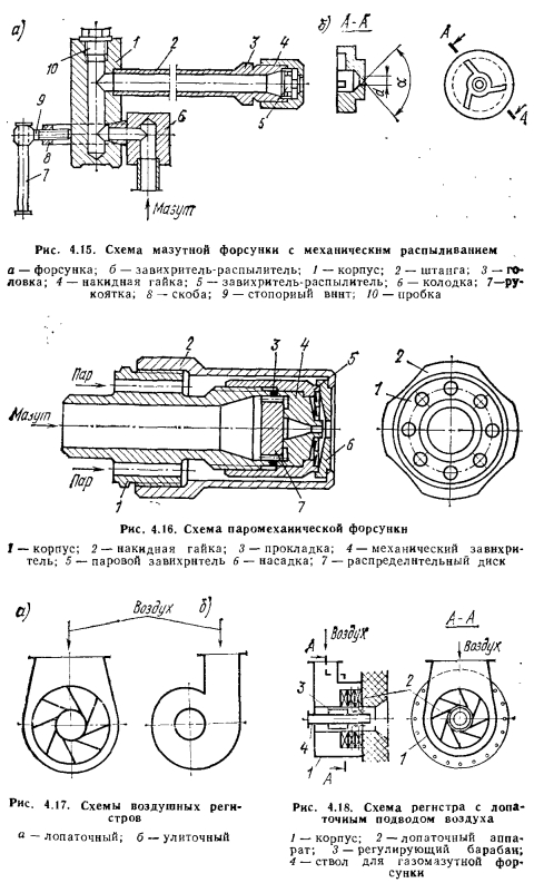 Мазутные горелкиДля рыспыления мазута применяют центробежные форсунки, которые вместе с завихревающими устройствами — регистрами, служащими для подачи воздуха, образуют мазутную горелку. В зависимости от метода распыления различают форсунки паровые и механические. В паровых форсунках распыление топлива достигается в результате использования кинетической энергии струи пара, вытекающей из форсунки. В форсунках с механическим распылением используется кинетическая энергия струи мазута, создаваемая давлением топливного насоса. Выходя под давлением с повышенной скоростью через небольшое отверстие форсунки, мазут распыляется. Кроме механических и паровых имеются также комбинированные форсунки, работа которых основана на совместном использовании обоих методов распыления. ![]() |