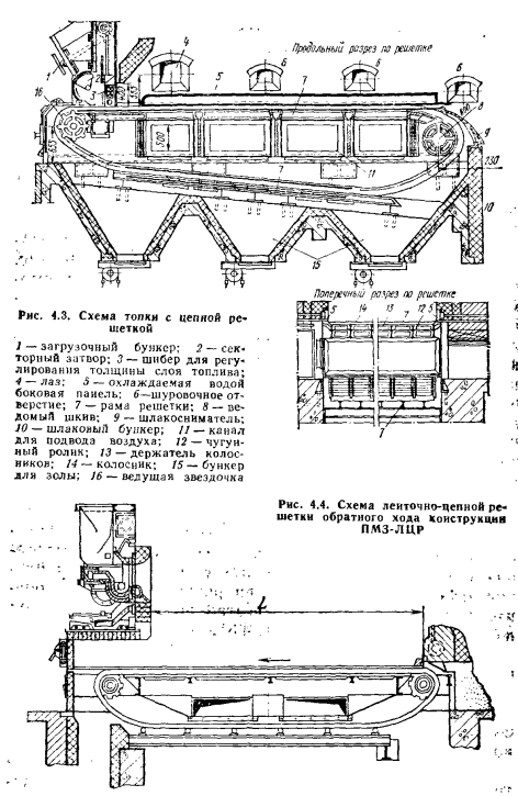 Механическиеслоевые топки с цепными решеткамиХарактерной особенностью механических топок с цепными решетками являются непрерывное перемещение топлива вместе с колосниковой решеткой, представляющей собой транспортер, выполненный в виде бесконечного полотна. Принципиальная схема механической топки с цепной решеткой показана на рис. 4.3. Чешуйчатая цепная решетка ЧЦР выполнена из наклонно расположенных беспровальных колосников и имеет длину 5600—8000 мм, ширину 2330—4550 мм. По длине решетки процесс горения достаточно четко разделяется на следующие этапы: подготовка топлива (подсушка, выделение летучих); горение кокса и летучих; выжиг и удаление шлака. Учитывая, что для различных этапов горения требуется разное количество воздуха, принимают позонное дутье (см. рис. 4.3). Слой топлива на решетке условно можно разделить на следующие характерные зоны: 1 — свежего топлива; 2 — выхода и горения летущих; 3 — горения кокса; 4 — восстановительных реакций; 5 — выжига шлака. Для различных зон горения топлива потребность в воздухе по длине колосниковой решетки неодинакова. Наименьшее количество воздуха требуется в начале и в конце решетки (т. е. там, где происходят воспламенение топлива и выжиг шлака). В средней части решетки, где происходит активное горение топлива, расход воздуха должен быть максимальным. Этим определяется целесообразность применения в цепных решетках погонного дах, подводящих воздух в каждую камеру-зону, установлены шиберы для изменения расхода воздуха в зоны. Применение позонного подвода воздуха улучшает горение топлива, а также снижает потери теплоты с уходящими газами в связи с понижением общего избытка воздуха в топке. ![]() Особенностью тепловой работы топки с цепной решеткой являются одностороннее верхнее зажигание и отсутствие перемешивания топлива на полотне решетки. Эти обстоятельства ограничивают диапазон топлив, сжигаемых на цепных решетках. Слоевые топки с цепными решетками прямого хода применяются для сжигания сортированных антрацитов (АС и AM), несортированных каменных углей с умеренной спекаемостью, кускового торфа, а также бурых углей с небольшой влажностью и зольностью. Для сжигания рядовых каменных и бурых углей и сланца с содержанием мелочи размером 0—6 мм до 40 % применяются факельно-слоевые механические топки. Характерной особенностью таких топок является комбинированное сжигание топлива. Крупные куски сгорают в слое, а мелкие — во взвешенном состоянии в объеме топки. В таких топках топливо подается пневмомеханическими или пневматическими забрасывателями. На рис. 4.4 показана топка ПМЗ—ЛЦР с цепной решеткой обратного хода, у которого полотно со слоем топлива перемещается от задней стенки топочной камеры к фронтальной части агрегата. Топливо подается на решетку с помощью пневмомеханических забрасывателей. Более крупные фракции топлива, падая на дальнюю часть цепной решетки, пролетают более длинный путь. Мелкие частицы топлива ложатся на горячий слой топлива ближе к фронтальной части котельного агрегата. v . |