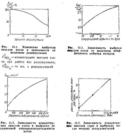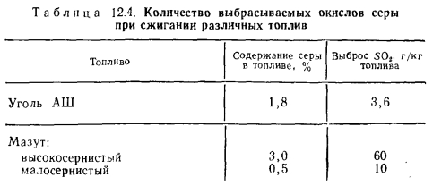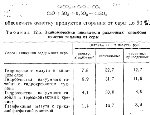 МЕТОДЫ СНИЖЕНИЯ И ПОДАВЛЕНИЯ ГАЗООБРАЗНЫХ ВЫБРОСОВСуммарный выброс окислов серы (S02+S03) определяется содержанием серы в топливе, поступившем в топку, и практически не может быть изменен применением различных способов и режимов его сжигания. Учитывая, что с каждым годом среднее содержание серы в топливе растет (что связано с переходом на сжигание низкосортных топлив), возрастает и количество выбрасываемых в атмосферу сернистых соединений. Связь между содержанием серы в топливе и количеством выбросов S02 видна из табл. 12.4 Принципиально можно рассматривать три направления в снижении выбросов соединений серы: 1) удаление серы из топлива до его сжигания; 2) новые методы и режимы сжигания; 3) очистка от соединений серы продуктов сгорания. Рассмотрим кратко каждое из этих направлений. На нефтеперерабатывающих заводах серу удаляют гидроочисткой. При этом капитальные затраты составляют примерно 3 руб/т на каждые 0,5 % понижения серы в мазуте. Простейшим обогащением подмосковного бурого угля-дробленки удается удалить 25— 30 % серы. Для отделения от угля колчеданной и органической серы может быть применено гидротермическое обессеривание углей, заключающееся в обработке измельченного топлива в автоклавах при давлении 1,75 МПа и температуре ~300°С щелочными растворами, содержащими гидраты окисей натрия и калия. При этом получается уголь с весьма малым содержанием серы, который отделяется от жидкости центрифугированием и затем сушится. ![]() Сериистость сжигаемого топлива снижают, подвергая его воздействию высоких температур с использованием окислителей (газификация) или без них (пиролиз). Процесс газификации протекает в условиях высоких температур (900—1300СС) при ограниченном доступе кислорода. При комплексном энерготехнологическом использовании топлива возникает задача получения из топлива химического сырья и чисто энергетического топлива; для термического разложения мазута можно использовать высокотемпературный пиролиз (/ = 700—1000 °С без доступа окислителя) с последующей газификацией твердого продукта (нефтяного кокса). Экономическое сопоставление различных способов переработки топлива с целью удаления серы приведено в табл. 12.5. Сжигание топлива в кипящем слое размолотого известняка при 900°С позволяет за счет реакций: ![]() Наиболее распространенным является сжигание мазута с низкими избытками воздуха (а= 1,01). Так, при снижении избытков воздуха в топке с а = 1,05 до а=1,01 снижается выход окислов серы на ~30%. Все известные способы улавливания SO2 из продуктов сгорания (дымовых газов) можно разделить на два класса: сухие и мокрые. Сухой способ получил широкое распространение в СССР и за рубежом. В этом случае продукты сгорания контактируют с магнезитом, известняком, активированным углем или окислами марганца. При этом протекают следующие реакции: при использовании извести Ca0H2+S02 = CaS0j+H20; при использовании известняка CaC03+S02=CaS03+C02. В результате этих реакций получается сульфит кальция, частично окисляющийся в сульфат. В большинстве случаев продукты нейтрализации не используются и направляются в отвал. При мокром способе предварительно готовят суспензию известняка (г. е. смешивают его с водой). Продукты сгорания, проходя через мокрый скруббер (очиститель), контактируют с известняком. Химические реакции аналогичны приводимым выше. Расход известн
