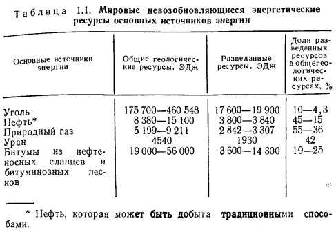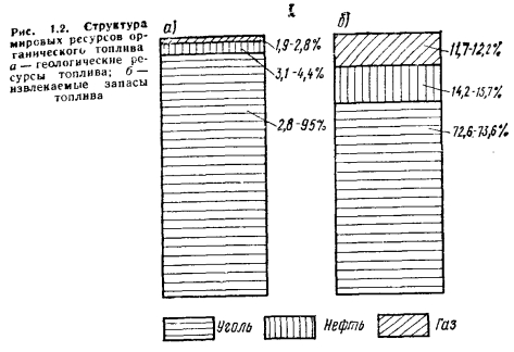 Невозобновляющиеся энергетические ресурсыОтличительной особенностью невозобновляющихся энергетических ресурсов (угля, нефти, природного газа, урана и др.) являются их высокий энергетический потенциал и относительная доступность и целесообразность ![]() Наибольшие энергетические ресурсы органического топлива сосредоточены в угле. Общие прогнозируемые геологические ресурсы каменного и бурого угля составляют 6000—15 000 млрд. т у. т., что соответствует 175 700—460 548 ЭДж (табл. 1.1), причем из них запасы каменных углей и антрацитов составляют примерно 7 %, а бурых углей — 23 %. Разведанные запасы углей не превышают 600—680 млрд. т у. т., что соответствует 17 600—19 900 ЭДж, или 5—10 % их общегеологических запасов. Основные разведанные запасы угля (89 % всех мировых запасов) сосредоточены в СССР, США и КНР. При потреблении угля в количестве 3,043 млрд. т у. т. (1984 г.) разведанные запасы угля будут исчерпаны через 200—230 лет; при росте потребления угля в 5 % ежегодно время их исчерпания уменьшится до 110—120 лет. Геологических ресурсов нефти в мире в 20—30 раз меньше, чем угля, они составляют 286—515 млрд. т у. т., или 8380—15 100 ЭДж, в том числе разведанные запасы — 130—131 млрд. т у. т., или 3800—3840 ЭДж. Месторождения нефти разведаны значительно полнее, чем угля. Основные геологические ресурсы нефти расположены на Ближнем Востоке, в Северной Африке, в СССР, КНР и Северной Америке. Подсчитано, что при современном объеме потребления нефти (2 698 млн. т/год в 1984 г.) ее запасы будут исчерпаны через 35 лет. При добыче нефти степень извлечения ее из пласта не превышает 40 % запасов месторождения; при разработке новых технологий добычи нефти ресурсы ее месторождений могут быть увеличены в 2 раза. В мире есть также большие запасы так называемых нетрадиционных ресурсов нефти, для извлечения которой нужны новые технологии— это битуминозные пески и нефтеносные сланцы, а также уголь, который может быть сырьем в производстве синтетической нефти. Общие геологические ресурсы такой нефти составляют более 30 000 ЭДж, что в 2— 3 раза больше ресурсов традиционной нефти. Перспективными источниками добычи нефти являются также глубоководные морские и арктические месторождения, в которых запасы нефти могут составить до 230 млрд. т. При глубокой термохимической переработке из 1 т угля можно получить 0,5 т жидкого топлива. Однако жидкое топливо, полученное из нетрадиционных месторождений нефти, а также искусственным путем из угля, будет иметь себестоимость во много раз выше себестоимости добычи нефти традиционными способами и, очевидно, будет использоваться только для производства моторных топлив и в качестве сырья для химической промышленности. Ресурсы природного газа на Земле оцениваются в 177—314 млрд. т. у. т., что соответствует 5199— 9211 ЭДж; разведанные запасы составляют 39—55 % общегеологических и равны 2842—3307 ЭДж. Степень извлечения природного газа из месторождений равна ~80 % по отношению к запасам. Мировые запасы природного газа, оцениваемые по состоянию на 1 января 1982 г., расположены: на территории СССР—(40%), в странах Ближнего Востока — (25 %), в странах Северной Америки — (10 %). При уровне мировой добычи газа 1607 млрд. м3 в 1984 г. его запасов будет достаточно на 50—60 лет. Из анализа ресурсов органического топлива видно, что из них 93—95 % составляет уголь (рис. 1.2); именно ему предстоит сыграть ведущую роль в обеспечении энер