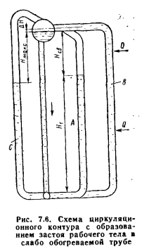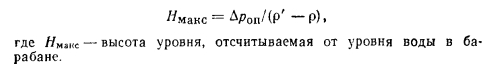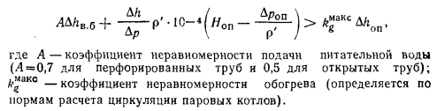 ОБЕСПЕЧЕНИЕ ЕСТЕСТВЕННОЙ ЦИРКУЛЯЦИИНадежная работа всех котельных труб, входящих в контур естественной циркуляции, обеспечивается поддержанием температуры их стенок, близкой к температуре насыщения, для чего создают такой режим парообразования в подъемных трубах, при котором на всей их поверхности поддерживают непрерывную водяную пленку. При этом условии происходит непрерывный отвод теплоты, обеспечивающий даже при весьма высокой тепловой нагрузке максимальное приближение температуры стенок к температуре рабочего тела. Кроме соблюдения этого важнейшего условия необходимо также для надежного охлаждения стенок труб сделать невозможным отложение на их внутренней стороне шлама или накипи. Такие отложения могут быть связаны с неправильным водным режимом котельной установки и с условиями циркуляции. При значительном снижении кратности циркуляции может не только разрушиться водяная пленка на поверхности труб, ио и произойти выпаривание растворимых солей, содержащихся в котловой воде, образование обильных местных отложений и как следствие этого — резкое повышение температуры стенки. Опасность перегрева металлических стенок труб возникает также при расслоении потока пароводяной смеси. Таким образом, чтобы убедиться в надежности работы подъемных труб, входящих в контур естественной ( циркуляции, необходимо выявить в них опасные режи- t мы. Такими опасными режимами для подъемной части контура являются: образование застоя рабочего тела в подъемных трубах, опрокидывание циркуляции, расслоение потока пароводяной смеси и режим предельной кратности циркуляции. Для опускной части контура опасным режимом является парообразование в опускных трубах, которое может возникнуть как следствие падения давления во входном сечении трубы (так называемая кавитация), так и в результате обогрева некоторой части длины опускных труб. Следствием парообразования в опускных трубах является срыв нормального поступления воды в подъемные трубы. Образование застоя рабочего тела в подъемных трубах происходит при значительной неравномерности их обогрева. На рис. 7.6 показана схема циркуляционного контура, в котором наряду с нормально обогреваемыми трубами В имеются слабо обогреваемые трубы А, а также необо- греваемая труба С. Высоту уровня в трубе С, характеризующую перепад давления между барабаном и коллектором (при условии, что вода в трубе находится при температуре насыщения), определяют из соотношения ![]() Очевидно, что при отсутствии обогрева труб А расположение свободного уровня в них (при вводе этой трубы выше уровня в верхнем барабане) будет таким же, как и в трубе С. При обогреве трубы А только на высоте НМакс положение уровня не изменится, так как циркуляция воды в трубе будет отсутствовать. Однако температура стенки быстро достигнет температуры окружающих газов, что приведет к разрыву трубы. Если труба А будет обогреваться только на участке ниже свободного уровня или одновременно на обоих участках трубы, но тепловая нагрузка ее будет незначительной, то свободный уровень в трубе А может образоваться в сечении, несколько превышающем сечение свободного уровня в необогрева- емой трубе. При увеличении обогрева трубы А тепловая нагрузка ее будет возрастать настолько, что количество пара, образовавшегося на нижнем участке, поды