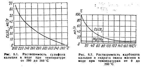 ОБЩИЕ ПОЛОЖЕНИЯПравильная организация водного режима котла имеет очень большое значение для его бесперебойной и экономичной работы. В питательную воду поступают различные примеси, в том числе соединения кальция и магния, окислы железа, алюминия и др. Главным источником их проникновения являются: присосы сетевой воды через неплотности в теплофикационных подогревателях; недостаточно высокое качество дистиллята и особенно химически очищенной воды, качество которой определяется составом воды и методом ее очистки. Наличие примесей в питательной воде приводит к образованию отложений на поверхностях нагрева паровых и водогрейных котлов и к нарушению их нормальной работы, ухудшению качества пара и воды и к интенсивному протеканию коррозионных процессов, могущих в сравнительно короткое время вывести из строя оборудование. Поэтому для бесперебойной и экономичной работы котла большое значение имеет правильная организация водного режима, которая обеспечивает высокую степень чистоты пара и воды, предотвращает образование отложений на поверхностях нагрева и защищает от коррозии. ![]() В котловой воде, представляющей собой водный раствор разнообразных химических соединений, протекают сложные физико-химические процессы, в результате которых происходит выпадение из раствора твердой фазы либо непосредственно на поверхностях нагрева, либо в толще котловой воды. В первом случае такое выпадение осадков называют первичным процессом накипеобразования, в результате которого образуются твердые, прочно пристающие к металлу отложения. Во втором случае осадки вначале не связаны со стенками поверхностей нагрева и выпадают в толще воды в виде взвешенных частиц. В последующем скопления и уплотнения этих частиц, называемые шламом, либо превращаются в рыхлые массы, не прикипающие к поверхностям нагрева, и легко выводятся из котла путем его продувки, либо прикипают к поверхностям нагрева, образуя вторичные отложения. Выпадение твердой фазы из котловой воды может происходить вследствие: а) реакций между различными веществами, находящимися в воде; б) понижения растворимости некоторых солей с повышением температуры (соли с отрицательным коэффициентом растворимости); в) повышения концентрации солей при кипении воды. Протекание в нагреваемой и испаряемой воде реакций между различными соединениями, находящимися в ней, может привести к образованию и выпадению из раствора труднорастворимых веществ. Таковыми являются сульфат кальция CaS04, карбонаты СаС03 и MgC03, силикаты CaSi03 и MgSi03, гидроокиси Са(ОН)2 и Mg(OH)2 и т. п. Выделение твердой фазы из раствора происходит главным образом при упаривании воды, которое сопровождается таким повышением концентрации солей, при котором раствор приближается к состоянию насыщения. Понижение растворимости некоторых веществ с повышением температуры также приводит к их выпадению в осадок. К таким веществам относятся труднорастворимые соли кальция и магния, характеризующиеся отрицательным коэффициентом растворимости. Зависимостьрастворимости некоторых соединений кальция и магния от температуры показана на рис. 8.1 и 8.2. Образующиеся в котлах отложения различаются физическими свойствами и химическим составом. Основными физико-механическими показателями отложений являются пористость, твердость и теплопрово