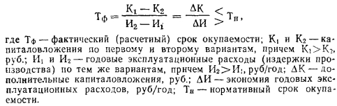 ОПРЕДЕЛЕНИЕ СРАВНИТЕЛЬНОЙ ЭКОНОМИЧЕСКОЙ ЭФФЕКТИВНОСТИ КАПИТАЛОВЛОЖЕНИЙ И НОВОЙ ТЕХНИКИВыбор оптимального варианта проектного или планового решения производят на основе определения показателей сравнительной эффективности капиталовложений и новой техники. При этом используют метод окупаемости, позволяющий соизмерить по сравнимым проектным вариантам капиталовложения и эксплуатационные расходы и на этой основе выбрать из них наилучший: ![]() Условие выбора первого варианта: Тф<Тн; условие выбора второго: Тф>Тн. Фактический (расчетный) срок окупаемости определяет период, в течение которого возмещаются дополнительные капиталовложения по более капиталоемкому, но технически более совершенному варианту за счет экономии, получаемой на эксплуатационных расходах по этому варианту. Эту формулу можно записать так: ![]() Существуют такие понятия коэффициентов сравнительной эффективности капиталовложений: нормативный 1/ТН; фактический 1/Тф. При необходимости сопоставить три проектных варианта и более рекомендуется пользоваться методом срока окупаемости в форме приведенных затрат: ![]() |