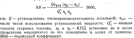ОСНОВНЫЕ ВИДЫ ПОТЕРЬ ТОПЛИВА В ТЕПЛОСТАНДИИ И КЛАССИФИКАЦИЯ МЕРОПРИЯТИЙ ПО ИХ СНИЖЕНИЮЗа последние годы в результате комплекса технических, экономических и организационных мероприятий, направленных на сокращение потерь топлива в процессе использования его в теплогенерирующих установках, достигнут высокий технический уровень эксплуатации. Теплостанции, построенные за этот период по унифицированным типовым проектам, резко отличаются от теплостанций старой постройки. При хорошем качестве монтажа и квалифицированной эксплуатации современных теплостанции может быть достигнут достаточно высокий уровень использования топлива. Наряду с этим в теплостанциях имеются резервы экономии топлива за счет устранения потерь по следующим причинам: при хранении топлива на складе; из-за отсутствия систематического контроля за соблюдением норм расхода топлива и анализа его потерь; вследствие неудовлетворительной постановки учета выработки теплоты и расхода топлива; применения топлива, не соответствующего по фракционному составу, зольности, влажности, составу золы, конструктивным особенностям топочных устройств; потерь теплоты на собственные нужды; из-за неисправности или отсутствия измерительных приборов и теплотехнического контроля и устройств автоматики; вследствие неудовлетворительного ведения топочного процесса и потерь в связи с этим от механической и химической неполноты сгорания, а также вследствие зашлаковывания топки; ввиду больших присосов воздуха по газовому тракту теплогенерирующей установки, что приводит к большим потерям с уходящими газами; наружного загрязнения поверхностей нагрева, связанного с несоблюдением установленного режима очистки или некачественной ее наладки; внутренних отложений на поверхностях нагрева, связанных с нарушением водно-химического режима; неудовлетворительного состояния основной изоляции элементов котлоагрегата, газоходов и трубопроводов; неиспользования теплоты непрерывной продувки; несоблюдение оптимальных режимов работы источников теплоснабжения; нерационального режима теплоснабжения потребителей (перетоп) отапливаемых зданий; отсутствия регулирования расхода теплоты в нерабочие дни и часы и т. д.; больших потерь конденсата; относительно невысокой квалификации обслуживающего персонала; недостаточной воспитательной работы с персоналом и неэффективного стимулирования персонала за экономию топлива. Если в результате реконструкции при улучшении режима эксплуатации удается повысить КПД теплогенерирующей установки, то годовую экономию (т/год) рассчитывают по формуле ![]() Наряду с устранением потерь не менее важным в перспективе развития экономичных источников теплоты систем теплоснабжения является решение следующих задач: 1) повышение централизации и концентрации производства пара и теплоты за счет строительства крупных современных теплостанций и ликвидации при этом мелких устаревших; 2) ускорение разработки и внедрения в производство нового, более экономичного оборудования; 3) поставка паровых и водогрейных источников теплоснабжения в укрупненных блоках, что значительно снизит стоимость монтажа и повысит КПД агрегата за счет снижения присосов воздуха и т. д.; 4) повышение качества топлива, предназначенного для сжигания в слоевых топках; 5) максимально