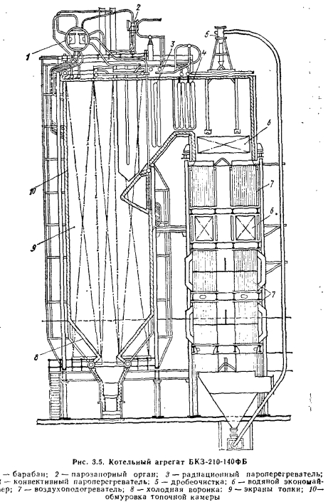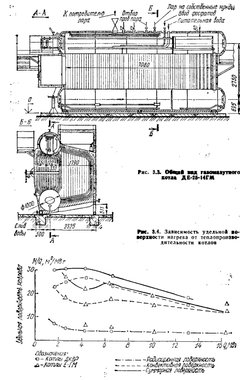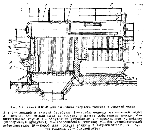 Паровые котлыВ настоящее время широко распространены в различных отраслях промышленности, сельском и коммунальном хозяйстве котлы типа ДКВР (двухбарабанные котлы, водотрубные, реконструированные), рассчитанные на рабочее давление 1,4 МПа с номинальной производительностью 2,5; 4,0; 6,5; 10 и 25 т/ч. Используются также котлы этого типа, работающие при давлении 2,4 и 4,0 МПа. Котлы выпускают с топками для сжигания твердого (в слое) (рис. 3.2), жидкого и газообразного топлива. Твердое топливо из бункера 12 пневмомеханическим забрасывателем 9 подается на колосниковую решетку 8 и образует слой, в котором происходит его сгорание. При горении образуются продукты сгорания, которые движутся из топочного объема в конвективные газоходы, отдавая теплоту конвективному (кипятильному) пучку труб 4. В топке теплота от горящего топлива и продуктов сгорания отдается излучением экранным поверхностям 11. Воздух в пневмомеханический забрасыватель подается по воздушному коробу 10. Котлы ДКВР отличаются достаточно высокой экономичностью, небольшой массой, простотой конструкции, малыми габаритами и транспортабельностью. Наличие в котлах развитого кипятильного пучка обеспечивает глубокое охлаждение продуктов сгорания, в результате чего достигается высокая их экономичность. Экранированная топочная камера обеспечивает интенсивный теплообмен продуктов сгорания с экранными поверхностями нагрева, а небольшие тепловые напряжения экранов — надежную и длительную работу обмуровки котла. Плотное расположение кипятильных труб малого диаметра в пучке—характерная особенность этих котлов. Движение газов в котлах — горизонтальное с несколькими поворотами. ![]() Котлы допускают компоновку с различными топочными устройствами. Котлы ДКВ и ДКВР выпускают с топками для сжигания бурых и каменных углей, фрезерного торфа, древесных отходов, мазута и газа. Нижний барабан служит шламоотстойником и имеет продувочный патрубок 7 с вентилями. Боковые экраны котлов 11 питаются из нижнего 6 и верхнего 1 барабанов с помощью перепускных труб. Такая схема питания обеспечивает надежную работу котла. Для уменьшения потерь от механической неполноты сгорания топлива топка котлов разделена на две части: собственно топку и камеру догорания. В последние годы на смену котлам ДКВР созданы новые котлы серии Е для работы на газе и мазуте ДЕ и твердом топливе КЕ производительностью 4,0; 6,5; 10; 16; 25 т/ч для сжигания газа и мазута и 2,5; 4; 6,5; 10; 25 т/ч со слоевыми топочными устройствами для сжигания твердого топлива. Котлы КЕ-2.5-14С оборудуют по- лумеханическими топками ЗП-РПК с пневмомеханическим забрасывателем и ручными поворотными колосниками. В качестве топочного устройства для сжигания отечественных каменных и бурых углей в котлах КЕ паропроизводительностью 4; 6,5; 10 т/ч применяются топки типа ТЛЗМ с пневмомеханическими забрасывателями и моноблочной ленточной цепной решеткой обратного хода. Цепные решетки топок ТЛЗМ поставляют заказчику в блочном исполнении, что существенно повышает их эксплуатационную надежность. Рама решетки служит опорой коллекторов боковых экранов котлов. Котлы КЕ-25 оборудуют механическими топками ТЧЗ с чешуйчатой цепной решеткой обратного хода и пневмомеханическими забрасывателями. За котельными агрегатами в случае сжигания каменных углей и бурых углей с приведенной в
