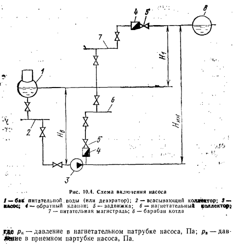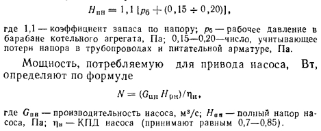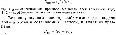 ПИТАНИЕ КОТЕЛЬНОГО АГРЕГАТАВоду в котлы подают питательной установкой. С особой надежностью должно производиться питание паровых генераторов высокого (повышенного) давления. В этом случае даже кратковременное прекращение питания может привести к тяжелой аварии, связанной с потерей воды и пережогом стенок подъемных труб и барабана котла. В производственно-отопительных котельных для подачи питательной воды в агрегаты применяют обычно поршневые насосы с паровым приводом и центробежные с электрическим приводом. Кроме того, в некоторых небольших отопительных котельных в качестве питательных устройств используют инжекторы, а также ручные насосы. Из паровых насосов наибольшее распространение в отопительных установках получили поршневые насосы ПВД и ПДГ, предназначенные в основном для питания паровых котлов водой при температуре до 100 °С. Насосы этого типа выпускают как с вертикальным, так и с горизонтальным расположением цилиндров. Эти насосы используют в паровых котлах с рабочим давлением 0,4—2,0 МПа, производительностью 2—6 т/ч. Указанные насосы имеют недостатки: низкую экономичность, высокий расход пара, неравномерность подачи воды, чувствительность к механическим примесям и загрязнениям и др. В связи с этим их обычно используют как резервные. В качестве основного устройства применяют центробежные насосы с электрическим приводом. Центробежные насосы подают воду равномерно. Производительность их зависит от размеров и числа оборотов. Насосы большой производительности выполняют сдвоенными с двухсторонним всасыванием. Преимущества центробежных насосов: высокая экономичность и надежность работы, удобство регулирования производительности, простота в обслуживании и др. К недостаткам следует отнести: необходимость держать насос под заливом или заполнять его перед пуском; резкое уменьшение производительности при износе и снижении давления при повышении производительности; уменьшение КПД при малых производительностях и большом напоре. В котлах большой мощности в качестве резервных применяют центробежные насосы с приводом от вспомогательной паровой турбины — турбонасосы. Для питания водой мелких отопительных котельных применяют инжекторы. Инжекторы являются пароструйными устройствами. Для надежной работы инжекторов температура питательной воды должна быть не выше 40 °С и высота подачи — не более 2 м. Расход пара инжекторами составляет 7—9 % количества подаваемой воды. Большая часть теплоты этого пара расходуется на подогрев воды и возвращается в котельный агрегат. Инжекторы отличаются простотой устройства и их обслуживания, занимают мало места. Выбор типа, количества и производительности насосов производится в соответствии с правилами Госгортехнадзора. Для обеспечения необходимой надежности питания паровых котельных агрегатов повышенного давления (р1,7-105 Па) устанавливают не менее двух питательных насосов с независимыми приводами — электрическим и паровым. Один из них (обычно паровой) является резервным. Производительность каждого из насосов выбирают не менее 120 % максимальной выработки пара всех работающих котлов. При установке трех и более насосов суммарная производительность их должна быть такой, чтобы при временном выходе из строя самого мощного из них остальные могли обеспечить 120 %-ную максим