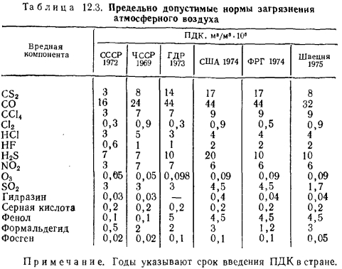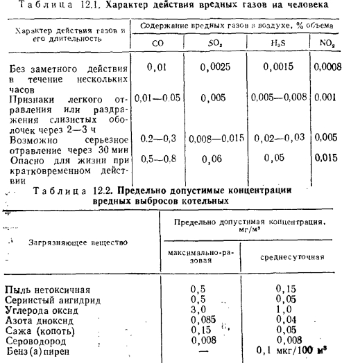 Предельно допустимые концентрации вредных веществ в атмосфереНаиболее опасными по степени воздействия на организм человека и выбрасываемыми в значительных количествах с продуктами сгорания являются: 1) оксид углерода СО; 2) оксиды серы S02 и S03 и 3) оксиды азота N0. При вдыхании воздуха с содержанием в нем 0,04 % оксида углерода в крови человека в соединение с ним вступает до 30 °/о гемоглобина крови, а при содержании 0,1 % СО в соединение с ним вступает до 50 % гемоглобина, что очень вредно сказывается на здоровье человека. При содержании в воздухе СО до 0,4—0,5 % вдыхание воздуха опасно для жизни уже в течение нескольких минут. Опасность усугубляется тем, что оксид углерода не обладает ни запахом, ни цветом. Очень вредно воздействует оксид углерода уже при небольших содержаниях на физиологические центры человека, что сказывается, в частности, на способности человека управлять автомашиной. В результате медико-биологических исследований установлено, что при кратковременном воздействии на человека диоксида серы с концентрацией 130—650 мг/м3 наступают сильное раздражение голосовых связок и последующее удушье. При концентрациях, превышающих 26 мг/м3, наблюдается раздражение глаз и дыхательных путей. Меньшая концентрация S02 для людей, по-видимому, безвредна. Это подтверждается состоянием здоровья людей, работающих на производстве, где концентрация S02 составляет 6,5 мг/нм3. Характерно, что диоксид серы наиболее опасен в тех случаях, когда он действует совместно с другими соединениями. Роль последних сводится к тому, что они способствуют более глубокому прониканию S02 Е дыхательные органы человека. Особенно чувствительны к диоксиду серы растения. Даже при концентрации S02, равной 1,3—2,6 мг/нм3, в них нарушаются процессы фотосинтеза. При длительном воздействии S02 растения гибнут. В сочетании с большой запыленностью и влажностью воздуха вредное воздействие диоксида серы резко возрастает. В этих случаях опасность для здоровья людей появляется даже при обычно безвредных концентрациях диоксида серы. Только концентрация 0,584 мг/нм3 безопасна для человека, животного и растительного мира, и поэтому в СССР принята норма 0,5 мг/нм3. В продуктах горения любых топлив, содержащих углеродистые соединения, в случае недостатка воздуха для полного сгорания и нарушениях условий правильного сжигания появляется оксид углерода. Оксид углерода — чрезвычайно сильный отравляющий газ. Поэтому продукты сгорания газового топлива как твердого, так и жидкого могут быть токсически весьма опасными. При сжигании углеводородных топлив при температуре свыше 1500°С образуются весьма вредные для человека окислы азота. Их содержание в воздухе из-за большой ядовитости должно быть предельно ограничено. Степень действия некоторых газов характеризуется данными табл. 12.1. Эти нормы, разработанные на основании большого числа медико-биологических исследований, должны обеспечивать нормальную жизнедеятельность человека в течение всей его жизни, а среда при соблюдении этих норм должна быть безвредной для окружающего нас животного и растительного мира. ![]() У нас в стране приняты три вида норм, которые носят название предельно допустимые концентрации (ПДК). ПДКрз — в рабочей зоне; ПДКмр — максимальные разовые; ПДКсс — среднесуточные; ПДКрз — касаются рабочей зоны помещений — цехов предпр