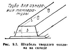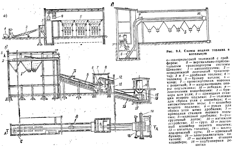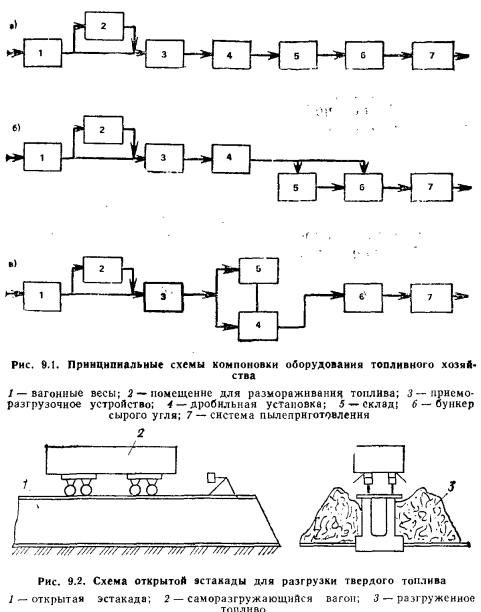 ПРИНЦИПЫ ОРГАНИЗАЦИИ ТОПЛИВНОГО ХОЗЯЙСТВАТопливное хозяйство тепловых станций (котельных) представляет собой сооружения, устройства и механизмы, необходимые для приема, разгрузки, хранения, перемещения и подачи топлива в. котельные и топки котлов, а также для его обработки и подготовки к сжиганию. Принципиальная схема топливного хозяйства, условия и особенности его работы в каждом конкретном случае определяются многими факторами, основными из которых являются: а) вид, свойства и способ сжигания топлива; б) производительность котельной и ее расположение; в) способ доставки топлива. Вид топлива, сжигаемого в котельной, и схема топливного хозяйства оказывают существенное влияние на общую компоновку генерального плана и теплостанции. В общем случае топливное хозяйство разделяется на следующие участки: 1) узел доставки и приема поступающего топлива (разгрузка); 2) склады топлива; 3) устройства для подачи топлива в помещение теплостанции; 4) первичная подготовка топлива; 5) учет прибывающего и расходуемого топлива; 6) подготовка топлива к сжиганию; 7) подача топлива в топку котла. Проектирование топливного хозяйства теплостанции ведется на основании нормативных документов; при максимальном расходе топлива ВР<150 т/ч—по СНиП-Н- 35-76 Котельные установки; при ВР>150 т/ч — по нормам проектирования топливного хозяйства электростанций Минэнерго. Топливное хозяйство должно обеспечивать надежную бесперебойную подачу необходимого количества топлива к тепловым станциям. При проектировании необходимо предусматривать: механизацию и автоматизацию всех процессов, связанных с транспортированием, разгрузкой, хранением, подготовкой к сжиганию и подачей в бункера котлов и в топки; обеспечение минимальной величины непроизводительных потерь топлива; уменьшение капиталовложений (начальных затрат) и эксплуатационных расходов на топливное хозяйство котельной. Топливное хозяйство промышленных и отопительных теплостанций (котельных) при сжигании твердого топлива наиболее сложное и дорогое. Принципиально технологическая схема компоновки оборудования топливного хозяйства может иметь различные варианты (рис. 9.1): а) все поступающее топливо, пройдя вагонные весы 1 (см. рис. 9.1, а), помещение 2 для размораживания вагонов с топливом в зимнее время, поступает в приемно-разгрузочное устройство 3, откуда подается системой транспортирующих устройств через дробильную установку 4 на склад 5. Со склада по мере необходимости топливо направляется в бункера сырого угля теплостанции б и из них через систему пылеприготовления 7 в топки котельной установки; б) все поступающее топливо, пройдя вагонные весы 1 (см. рис. 9.1, б), помещение для размораживания вагонов топлива в зимнее время 2, приемно-разгрузочное устройство 3, дробильную установку 4, направляется в бункера теплостанции 6 или на склад 5. Питание бункеров теплостанции может вестись со склада 5 или непосредственно после разгрузки топлива через дробильную установку 4. Из бункеров 6 топливо поступает в систему после пылеприготовления 7; в) все поступающее топливо, пройдя вагонные весы 1 (см. рис. 9.1, е), помещение 2 для размораживания вагонов топлива в зимнее время, приемно-разгрузочное устройство 3, откуда оно направляется в дробильную установку 4 или на склад 5. Бункера 6 питаются топливом из дробильной установки 4, в 