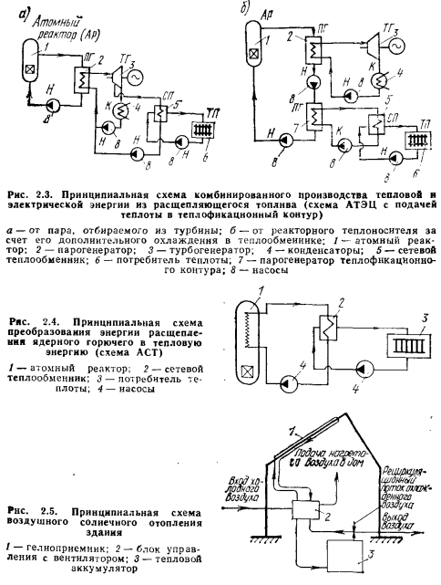 Принципиальные схемы производства тепловой энергии из ядерного горючегоПроизводство тепловой энергии из ядерного горючего для систем централизованного теплоснабжения возможно тремя способами: нерегулируемым отбором пара от конденсационных паровых турбин атомных тепловых электростанций (АЭС); получением тепловой энергии совместно с электрической энергией в комбинированных схемах на атомных теплоцентралях (АТЭЦ), а также получением тепловой энергии на атомных станциях теплоснабжения (ACT). Использование нерегулируемых отборов пара от конденсационных паровых турбин не меняет технологическую схему производства электрической энергии на АЭС, однако позволяет повысить эффективность использования ядерного горючего, поэтому достаточно широко используется. АЭС мощностью 4000 МВт (электрическая) с реакторами ВВЭР-1000 может нести тепловую нагрузку ъ 1340—1650 ГДж/ч, а с реакторами РБМК-1000 — до 2520 ГДж/ч при снижении электрической мощности турбогенератора всего на 2—6 %. Более эффективно используется ядерное горючее в схеме комбинированного производства тепловой и электрической энергии, реализуемой на АТЭЦ. Схема АТЭЦ (рис. 2.3, а), аналогичная схеме ТЭЦ на органическом топливе, имеет три контура: в первом контуре теплоноситель из атомного реактора 1 направляется в парогенератор 2, где охлаждается и затем возвращается в реактор. Во втором контуре схемы рабочее тело — вода вводится в парогенератор 2, где испаряется, и далее в виде водяного пара направляется в турбогенератор 3 для преобразования его энергии в электрическую. Отработанный пар из турбогенератора 3 направляется в конденсатор 4 и далее вода насосом 8 возвращается в парогенератор 2. Часть пара отбирается из турбины турбогенератора 3 и направляется в сетевой теплообменник 5, откуда после охлаждения и конденсации насосом 8 возвращается в парогенератор 2. В третьем контуре вода нагревается в сетевом теплообменнике 5 и подается потребителю теплоты 6, от которого насосом 8 возвращается в сетевой теплообменник 5. Возможна схема (рис. 2.3, б), в которой теплофикационный контур включен непосредственно в контур реактора через второй парогенератор 7. В этой схеме, также являющейся трехконтурной, пар образуется в парогенераторе 7 и направляется в сетевой теплообменник 5, где теплота передается воде третьего контура, подающей тепловую энергию потребителю 6. Применение АТЭЦ целесообразно только при больших единичных мощностях (свыше 1500 МВт). При меньших мощностях более рационально одноцелевое преобразование ядерной энергии в тепловую на атомных станциях теплоснабжения (ACT). Схема преобразования энергии расщепления ядерного горючего в тепловую энергию (рис. 2.4) является, как правило, двухконтурной: первый контур включает атомный реактор 1 и сетевой теплообменник 2, а второй кон- тур — сетевой теплообменник 2 и потребителя теплоты ![]() Эта схема является технологически более простой, чем схемы АТЭЦ, и менее капиталоемкой; ACT работают при более низких параметрах воды в первом контуре (р = = 1,6 МПа, температура 170°С), и их размещение возможно ближе к теплопотребителю, чем АТЭЦ. |