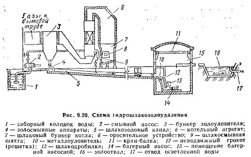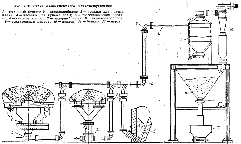 ШЛАКОЗОЛОУДАЛЕНИЕВ процессе сжигания топлива содержащаяся в нем зола выделяется в виде шлака, остающегося в топке, и в виде летучей золы, уносимой продуктами сгорания, частично оседающей в газоходах и улавливаемой в золоуловителях, а частично удаляемой через дымовую трубу в атмосферу. Шлак, удаляемый из топки, — это крупные бесформенные куски (размером до 250—300 мм) губчатой массы. Унос, осаждающийся в газоходах и золоуловителях, представляет собой сыпучую подвижную смесь частиц золы и несгоревшего топлива. Наряду с подачей твердого топлива удаление золы и шлака являются наиболее трудоемкими операциями. К шлакозолоудалению предъявляют следующие основные требования: обеспечение нормальных санитарно-гигиенических условий и безопасности работы; минимальные эксплуатационные расходы на удаление и транспортировку золы и шлака; возможность дальнейшего использования шлака и золы. Процесс шлакоудаления состоит из удаления шлаков и золы из котельных агрегатов, уборки н их транспортировки с территории. ![]() Основными способами шлакоуДаления являются: ручное, механизированное, пневматическое и гидравлическое. Ручное шлакозолоудаление применяют в небольших производственно-отопительных котельных. При ручном удалении используют узкоколейные вагонетки с опрокидывающим кузовом. Эти вагонетки перемещаются по рельсам. Шлак и зола перевозятся на шлакоотвал сухими. При механизированном периодическом шлакозолоудалеиии применяют скреперные установки, скиповые подъемники, скребковые транспортеры, шлаковыгружатели. В помещениях, где установлены котельные установки, наибольшее распространение получили схемы шлакозолоудаления со скреперными установками (рис. 9.18). Шлак и золу, предварительно залитые водой в бункере, сбрасывают в шлаковый каиал, откуда скрепером подают по наклонной эстакаде в сборный бункер, установленный вне здания. Для осмотра и ремонта скреперной установки вдоль канала делают сквозной проход шириной 1000 мм и высотой 1900 мм, отделенный барьером. В канале предусмотрены электрическое освещение и вентиляция. Скрепер передвигается по узкоколейным рельсам с помощью лебедки и тяговых каналов. Изменение направления движения скрепера осуществляется с помощью автоматически переключающего устройства. Для увеличения надежности работы скреперной установки проводка канатов имеет минимальное число направляющих роликов и перегибов. Из сборного бункера шлак автомашинами или железнодорожными вагонами вывозят на золоотвал. Для бесперебойной работы системы шлакозолоудаления рекомендуется предусматривать дублирующую скреперную установку, при этом обе установки могут работать одновременно порознь. Преимущество скреперной установки состоит в простоте ее конструкции, недостаток — малая надежность вследствие частых разрывов канатов. Пневмошлакозолоудаление. При этом способе шлак и зола удаляются по двум схемам: нагнетательной и всасывающей. В первой схеме шлак и зола транспортируются воздухом, который подается в трубопроводы высоконапорным вентилятором, и поэтому весь тракт находится под давлением. В случае неплотностей в стыках трубопроводов и их износа возможны утечки воздуха. Этого недостатка можно избежать, если применить всасывающую схему (рис. 9.19), по которой шлак и зола транспортируются воздухом, всасы