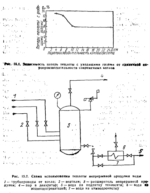 Снижение потерь теплоты с уходящими газамиНаибольшими потерями теплоты в тепловом балансе котельного агрегата являются потери с уходящими газами. Например, по данным испытаний ЦКТИ им. И. И. Ползунова, для котлов КЕ-6,5-14 потери с уходящими газами составляют 13 %, а для котлов КЕ-4- 14С—12%- Кроме того, потери с уходящими газами значительно зависят от единичной паропроизводительности котельного агрегата (рис. 15.1). Для снижения потерь теплоты с уходящими газами в основном применяют развитые конвективные антикоррозионные поверхности нагрева, такие, как воздухонагреватели из стеклянных труб, керамические набивки в регенеративных вращающихся воздухонагревателях и т. п. Следует всегда помнить, что снижение температуры уходящих газов на 12—14°С— это повышение КПД на 1 %. Основными мероприятиями, позволяющими снизить потери теплоты с уходящими газами, являются: 1) соблюдение минимального по условиям полного горения коэффициента избытка воздуха; 2) повышение газоплотности котлоагрегата и снижение присосов холодного воздуха; 3) борьба со шлакованием экранных и радиационных поверхностей нагрева путем отладки топочного режима; 4) регулярная качественная очистка наружных поверхностей нагрева конвективных пакетов труб; 5) поддержание качественного водного режима с целью предотвращения внутренних отложений в трубах котельного агрегата; 6) поддержание в барабане котла номинального давления; 7) поддержание расчетной температуры питательной воды; 8) правильное конструктивное оформление конвективных поверхностей нагрева, обеспечивающее более полное омывание их газами со скоростью, обеспечивающей самообдувку; 9) обеспечение плотности непроницаемости газовых перегородок, предотвращающих протекание газов мимо конвективных па- кетов труб; 10) обеспечение марки и качества сжигаемого топлива соответствующего расчетному; 11) установка развитых хвостовых поверхностей нагрева; 12) применение для котельных, сжигающих природный газ, вакуумных деаэраторов, позволяющих снизить температуру питательной воды до 65—70 °С (по сравнению с температурой 104 °С при атмосферных деаэраторах), что позволит обеспечить более глубокое охлаждение уходящих газов. ![]() |