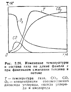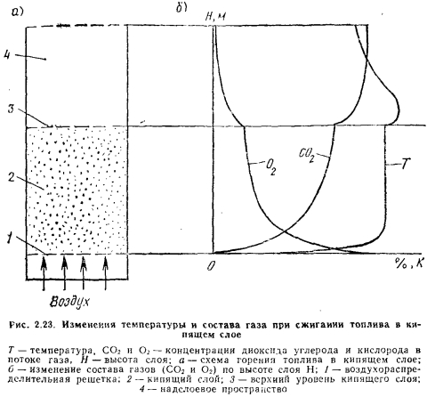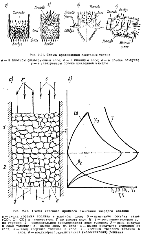 Способы сжигания органического топливаИзвестные способы сжигания органического топлива в потоке воздуха можно проклассифицировать, взяв за определяющий параметр скорость движения воздуха относительно скорости движения частиц топлива vT. По этому параметру выделяют технологию сжигания топлива: а) в плотном фильтрующем слое); б) в кипящем и фонтанирующем слое; в) в потоке воздуха; г) циклонное сжигание топлива (рис. 2.21). Часто сжигание топлива в кипящем и фонтанирующем слое объединяют одним термином—сжигание в псевдоожиженном слое. Сжигание топлива в плотном фильтрующем слое. Слоевой процесс сжигания применяется только для кускового твердого топлива, которое размещается плотным слоем на воздухораспределительной (колосниковой) решетке. Слой топлива продувается воздухом со скоростью, при которой устойчивость слоя не нарушается (см. рис. 2.21, а). Это обеспечивается при соблюдении неравенства ![]() Для обеспечения устойчивости слоя и уменьшения потерь топлива в результате уноса мелких его частиц продуктами сгорания при слоевом сжигании рекомендуется применение сортированного кускового топлива. В то же время чем крупнее топливо, тем меньше его удельная поверхность и тем меньше массовая скорость его сгорания. Поэтому при этом способе сжигания используется топливо классов 6—13; 13—25 или 25—50 мм (классы: семечко, мелкий, орех). При попадании в горящий слой кусок угля интенсивно прогревается (с большей скоростью, чем при горении в потоке), из него выделяется влага и разрабатывается поверхность внутренних пор Угля; выход влаги и летучих веществ изменяет структуру угольного вещества. Эти процессы протекают в узкой зоне у поверхности слоя, не превышающей размера среднего куска угля. ![]() Процесс горения топлива в слое можно разделить в обшем случае на две зоны: кислородную и восстановительную (рис. 2.22). В кислородной зоне основной реакцией является С-|-02 с образованием С02 и СО; в конце нее температура слоя достигает своего максимума. Размер кислородной зоны зависит от начального состава топлива (его зольности и влажности), крупности его кусков, температуры и не зависит от скорости воздуха. Для сухого малозольного топлива размер кислородной зоны составляет от 2 до 10 диаметров куска топлива. За кислородной следует восстановительная зона. В этой зоне завершаются окислительные реакции и активно протекают реакции восстановления Н20 и С02 при взаимодействии их с углеродом топлива. Эти реакции эндотермические, поэтому в восстановительной зоне температура снижается и образуются продукты вторичных реакций, в частности Н2 и СО. При слоевом сжигании высоту слоя стараются поддерживать на уровне, близком к высоте кислородной зоны. В случае если высота слоя больше, то для дожигания газообразных продуктов неполного горения СО, Н2 и др., а также иесгоревших в слое выделившихся из угля горючих летучих веществ над слоем вводят дополнительный поток воздуха. Обычно толщина слоя составляет от 0,07 до 0,7 м. В связи с гидродинамической неравномерностью слоя обтекание частиц топлива в слое происходит также неравномерно, что требует повышенного избытка воздуха (до 70%) для обеспечения высокой степени выгорания топлива. Горение твердого топлива в плотном слое протекает при малых тепловых потерях в окружающую среду, высоких температурах в диффузионной области