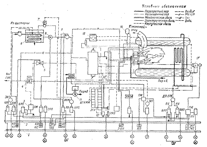 ТЕПЛОВОЙ КОНТРОЛЬ И АВТОМАТИЗАЦИЯ ПРОЦЕССОВ ГЕНЕРИРОВАНИЯ ТЕПЛОВОЙ ЭНЕРГИИУправление работой основного и вспомогательного оборудования котельной осуществляет дежурный персонал в соответствии с инструкциями и правилами эксплуатации. В задачу персонала по обслуживанию оборудования котельной установки входит обеспечение в каждый момент времени равенства между количеством пара, вырабатываемого котлом и его потреблением (нагрузкой). При этом должны поддерживаться на заданном значении те параметры, которые определяют нормальное протекание технологического процесса. Управление работой оборудования требует установки в котельной аппаратуры для контроля и управления. Такой аппаратурой являются контрольно-измерительные приборы, по которым осуществляется оперативное управление технологическими процессами, обеспечивающими надежную, безопасную и экономичную работу оборудования. Кроме того, по показаниям приборов получают исходные данные для составления отчета по работе агрегата в целом. Технологическому контролю подлежат следующие параметры: расход и параметры вырабатываемого пара— давление и температура; расход питательной воды и ее давление и температура; температура уходящих газов и воздуха; показатели продуктов сгорания; давление воздуха, разрежение в топке и других пунктах газового тракта котельного агрегата; качество и количество сжигаемого топлива; качества воды и пара; расход электроэнергии на собственные нужды и др. Текущий контроль и ведение режима осуществляются по показывающим приборам. Для измерения параметров, необходимых при подсчете технико-экономических показателей, а также при последующем анализе причин нарушения режимов или аварий устанавливают регистрирующие приборы. Изменения количества пара, воды и электроэнергии, необходимые для отчетности, производят по расходомерам с суммирующими счетчиками. В современных котельных для удобства обслуживания оборудования приборы контроля и управления расположены на тепловых щитах. Управление работой котельного агрегата осуществляется дистанционно путем воздействия на отдельные механизмы и устройства (дымососы, вентиляторы и др.). Расположение тепловых щитов может быть индивидуальным, групповым и централизованным. При индивидуальном управлении тепловые щиты устанавливают отдельно для каждого котельного агрегата. В этом случае их располагают вблизи перед фронтом котельного агрегата, что делает удобным сочетание с возможностью непосредственного наблюдения за работой оборудования. Кроме того, индивидуальное расположение щитов позволяет использовать более простые и надежные механические устройства и приборы управления (штурвалы к запорной и регулирующей арматуре, сниженные указатели уровня воды, штурвалы к шиберам и др.). Все операции по обслуживанию котельного агрегата при индивидуальной системе управления осуществляет дежурный персонал, состоящий из двух человек. Один из них находится у теплового щита, другой ведет наблюдения за работой вспомогательных механизмов по месту их установки (местное обслуживание). Такая организация надежна, но не экономична. Централизованная система управления является наиболее совершенной; она позволяет совмещать обслуживание всего оборудования котельной с одного центрального щита. Однако при