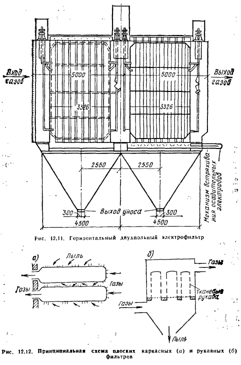 Тканевые фильтрыРукавные фильтры из фильтровальной ткани в настоящее время применяют в котлоагрегатах относительно небольшой производительности (от 23 до 90 т/ч). Рукавные тканевые фильтры различают между собой по следующим признакам: по форме фильтров (плоские, рукавные); наличию опорных устройств (каркасные, рамные); месту расположения вентилятора или дымососа (всасывающие, работающие под разрежением, и нагнетательные, работающие под давлением); способу регенерации тканей (встряхивание, обратная продувка, вибровстряхивание, импульсная продувка); числу секций в установке (односекционные и многосекционные); виду используемой ткани. ![]() На рис. 12.12 показана принципальная схема плоских каркасных и рукавных фильтров. Рукава чаще всего имеют диаметры от 127 до 300 мм и длину от 2,4 до 10 12 м. Плоские каркасные фильтры могут иметь следующие размеры: высота от 600 до 1200 мм, глубина от 300 до 500 мм, толщина от 25 до 50 мм. Если тканевые фильтры правильно сконструированы и обоснованно вы- бра на ткань (пористый материал), то эффективность улавливания пыли может составлять 99,999 %. При очистке (регенерации) рукавных фильтров производится механическое встряхивание закрепленных на общей жесткой раме рукавов. При продольном встряхивании происходит быстрое изнашивание рукавов, особенно в их нижней части. Колебательные перемещения вызывают меньший износ, но менее эффективны с точки зрения очистки, так как колебания плохо распространяются по длине рукава. Применяется очистка подачей воздуха с пульсирующим давлением со стороны, противоположной потоку газов. Обычно расход воздуха на очистку поверхности рукава принимается 1,37 м3/ /(м2-мин) при давлении воздуха 0,6 МПа. Рукавные фильтры из стекловолокнистой ткани с тефлоновым покрытием надежно выдерживают температуру 130— -220°С; сопротивление фильтров между циклами обратной продувки меняется от 0,5 до 1,5 кПа; эффективность составляет 99,7—99,9 %. |
