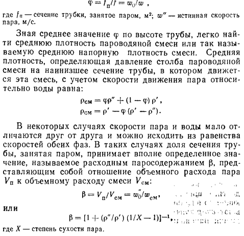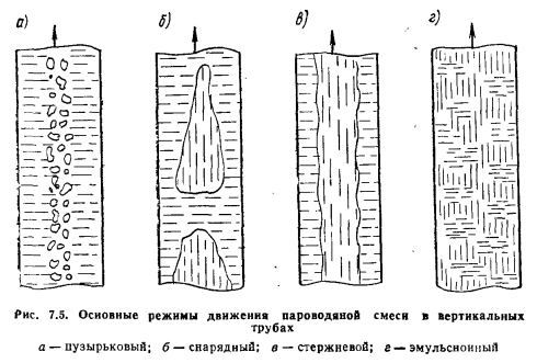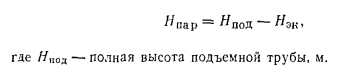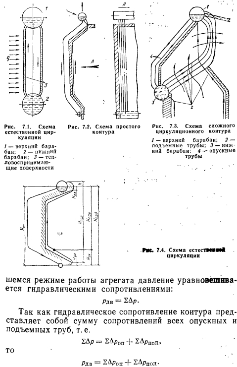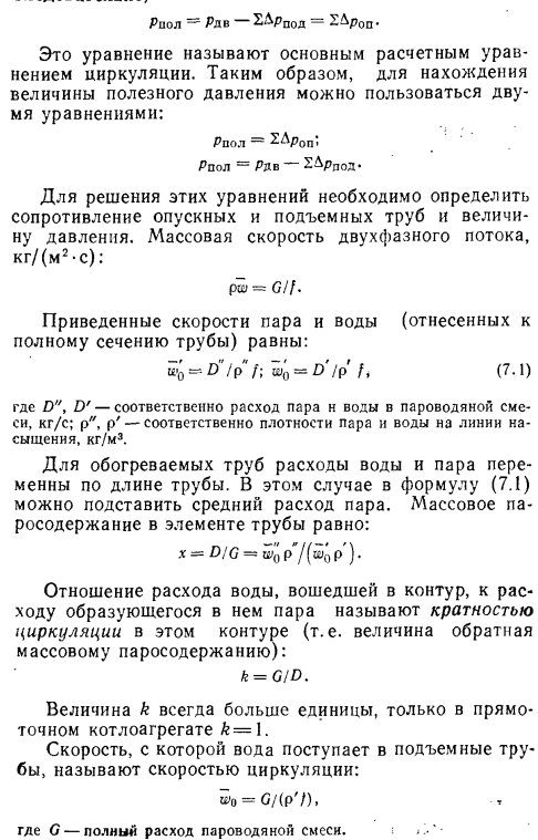 ВНУТРИКОТЛОВАЯ ГИДРОДИНАМИКАНадежная работа котельного агрегата возможна только при непрерывном охлаждении водой или паром его поверхностей нагрева. Если теплота, передаваемая продуктами сгорания поверхностям нагрева котельного агрегата, не будет от них отводиться, то температура металла может превысить допустимые пределы и агрегат выйдет из строя. Для надежного отвода теплоты необходимо обеспечить движение воды или пара вдоль поверхности нагрева. В экономайзерных и пароперегревательных поверхностях нагрева движение воды и пара происходит только принудительно под действием насоса или разности давлений пара в барабане или пароперегревателе. В испарительных же поверхностях нагрева движение воды и пароводяной смеси происходит либо принудительно под действием питательного насоса, либо за счет естественной циркуляции. Рассмотрим физическую сущность процесса естественной циркуляции (рис. 7.1). Если температура воды в обеих трубах одинакова, то вода в них остается неподвижной. Если же одну из них (например, левую) обогреть, то в ней начинается движение воды, особенно интенсивное после того, как вода в ней начнет испаряться. Так как плотность пароводяной смеси в левой трубе Рсм меньше плотности воды рв в правой трубе, то пароводяная смесь в левой трубе начнет подниматься и поступит в верхний барабан, где произойдет отделение воды от пард. Движение воды и пароводяной смеси в трубах котельного агрегата, вызванное разностью их плотностей, получило название естественной циркуляции. Трубы, в которых рабочее тело опускается, называются опускными, а трубы, в которых рабочее тело поднимается, называются подъемными. Таким образом, в рассматриваемом циркуляционном контуре под действием разности плотностей в опускных и подъемных трубах создается непрерывное движение воды или ее циркуляция. Эту разность плотностей называют движущим напором циркуляционного контура. Циркуляционные контуры котлоагрегатов делят на простые и сложные. Простыми называют такие, все звенья которых относятся только к данному контуру (рис. 7.2). В сложных циркуляционных контурах отдельные звенья являются общими для нескольких контуров, причем такими звеньями являются обычно опускные трубы. В качестве примера сложного циркуляционного контура на рис. 7.3 показана схема циркуляции двухбарабанного котла. Каждый ряд труб этого контура является отдельным его звеном, имеющим общую систему опускных труб. Современные котлоагрегаты имеют обычно несколько самостоятельных независимых циркуляционных контуров. При движении воды по опускным трубам давление возрастает на величину давления столба воды от уровня в барабане до рассматриваемого сечения. Одновременно повышается и температура насыщения воды. Заметим, что температура питательной воды обычно меньше температуры насыщения. Ту часть подъемной трубы, в которой отсутствует кипение, называют экономайзерным участком Яэк, а тот участок, по которому движется пароводяная смесь, называют паросодержащим участком Ящф (рис. 7.4). Очевидно, что высота паросодержащей части трубы ![]() Полезной высотой Япол называют ту часть ее высоты, которая создает циркуляцию воды в котлоагрегате. Она складывается из обогреваемой части экономайзерного участка и всей паросодержащей части, как обогреваемой, так и необогреваемой. 