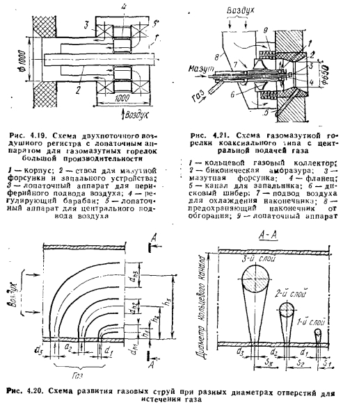 Воздушные регистрыДля эффективного сжигания мазута недостаточно тонкого его распыления. Необходимо также тщательно перемешать распыленный мазут с воздухом. Это достигается нагнетанием воздуха дутьевыми вентиляторами в топку через воздушные регистры (воздухонаправляющие устройства), обеспечивающие его интенсивное завихрение и подачу со скоростью 25—30 м/с в наиболее узком сечении амбразуры. По числу воздушных потоков регистры различают одно- и двухпоточные, а по характеру этих потоков — с закручиванием и незакручиванием потока (прямоструйные). В регистрах с закручиванием потока воздуха крутка воздушного потока осуществляется в лопаточном или улиточном аппарате (рис. 4.17). При большой производительности форсунки применяют регистры лопаточного типа (рис. 4.18). Лопатки поставлены под углом, и усиление завихрения потока воздуха интенсифицирует процессы смесеобразования и горения. С другой стороны, усиление завихрения вызывает увеличение сопротивления регистра и соответственно повышает расход котла. Установлено, что регистры с лопатками, расположенными под углом 45—50 °С, обеспечивают устойчивость работы, энергичное воспламенение и горение топлива при умеренном давлении воздуха перед горелкой (1—3 кПа). При снижении производительности мазутной форсунки расход воздуха приводят в соответствие с уменьшенным расходом мазута; при этом энергия завихрения потока уменьшается пропорционально квадрату падения скорости воздуха, вследствие чего ухудшается смесеобразование. Чтобы сохранить эффективное завихрение воздуха, перекрывают часть сечения регистра (пропорционально уменьшению расхода топлива). Это достигается перемещением вдоль оси горелки регулирующего шибера (на рис. 4.18 — регулирующего барабана 3). Мощные мазутные форсунки выполняют с более глубоким регулированием их производительности, причем расход воздуха приводится в соответствие с расходом топлива. Поэтому воздушные регистры для мощных форсунок также должны допускать более глубокое регулирование подачи воздуха. Часто мазут сжигают как резервное топливо, поэтому горелки должны допускать сжигание обоих видов топлива. Однако физико-химические свойства газа и мазута существенно различны, и поля воздушных потоков для этих топлив также должны быть при разных диаметрах отверстий для I газа различными, вследствие чего в мощных газомазутных горелках воздух часто подается двумя потоками с самостоятельным завихрением и регулированием каждого из них. Двухпоточный регистр с лопаточным аппаратом для форсунок большой производительности и широким диапазоном регулирования показан на рис. 4.19. В центральной трубе воздушного регистра по оси располагают мазутную форсунку. ![]() |