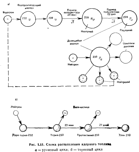 Расщепляющееся (ядерное) топливоРасщепляющимся (ядерным) топливом называется вещество, способное выделять большее количество тепловой энергии за счет торможения продуктов деления тяжелых ядер химического элемента при взаимодействии их с нейтронами. В энергетике в качестве ядерного топлива используют в основном природный изотоп урана235 искусственные изотопы; уран — 233 и плутоний — 239. Уран (U) — радиоактивный элемент с атомной масссй 238,03 в природе встречается в виде трех изотопов 238U, 235U, 234U; 99 % всех запасов урана в недрах Земли находится в виде изотопа 238U. Стабильных изотопов уран не имеет; конечные продукты его распада — гелий и стабильные изотопы свинца (206Рв и 207Рв), по накоплению которых определяют возраст исследуемого объекта. Основная руда, из которой получают уран, урановая смолка UsOg. Торий (Th) — естественный радиоактивный элемент с атомной массой 232, 038 — практически чистый изотоп 232Th, с периодом полураспада 1,4 1010 лет; сырье, из которого получают торий — монацитовый песок. Плутоний Ри — радиоактивный элемент с атомной массой 242, в природе не встречается. В качестве ядерного топлива используют долгоживущий изотоп 239Ри (период полураспада 24 400 лет). ![]() В природных условиях уран-235 находится в смеси с ураном-238, причем последний составляет 98—99 % массы природного урана. Чтобы повысить содержание в уране его изотопа 235U, уран обогащают, в результате чего содержание изотопа урана 235U удается увеличить с 1—2 до 40—80 %. Вероятность протекания реакции деления зависит прежде всего от энергии нейтронов. По скоростям движения нейтроны подразделяют: на медленные (или тепловые), энергия которых Еп = 0,03—0,5 эВ, промежуточные Еп = 1 -н 1 103 эВ и быстрые Еп = = 1 105 эВ и выше (1 эВ = 1,602-10-19 Дж). Чтобы реакция деления ядер началась, нейтронам необходимо преодолеть определенный энергетический барьер, т. е. иметь энергию выше энергии активации реакции деления. Величина энергии активации зависит как от вида ядер, так и от типа нейтронов. В процессе деления ядерного топлива образуются новые нейтроны,которые могут быть использованы для обеспечения самоподдерживающейся цепной реакции деления. Однако в результате деления ядерного топлива образуются преимущественно быстрые нейтроны. Чтобы снизить энергию и тем самым обеспечить их участие в реакции деления, организуют замедление этих нейтронов. В качестве замедлителя обычно используют обычную воду Н20, графит С, в ряде случаев тяжелую воду D20 и бериллий Be. Установлено, что ядра с нечетным числом нейтронов, имеющие большую энергию возбуждения при захвате нейтрона делятся, в основном, тепловыми нейтронами, а ядра с четным числом нейтронов, имеющие малую энергию возбуждения, делятся только под действием быстрых нейтронов (правило Бора). В связи с этим тяжелые ядра урана — 235, урана — 233 и плутония — 239 делятся под действием медленных (тепловых) нейтронов, а ядра урана — 238 и тория — 232—быстрых нейтронов. Поскольку ядра с четным числом нейтронов делятся быстрыми нейтронами, был разработан метод деления ядер урана—238 232 этими нейтронами, при котором одновременно с выделением энергии, образуются изотопы плутония—239 и урана—233, делящиеся тепловыми нейтронами (рис. 1.11). Таким образом, одновременно с реакцией деления ядер топлива в этом случае происходит накопление других изотопов урана и плутония, что увеличивает зап