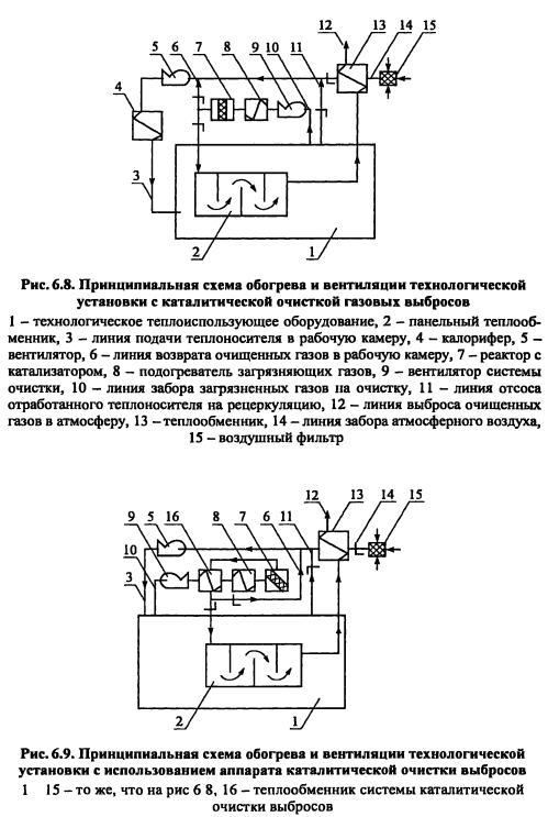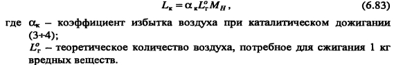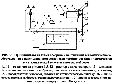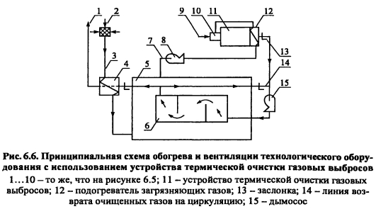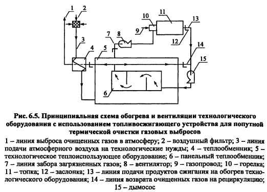 Энергосбережение в системах очистки газовых выбросов при объединении с энерготехнологиейПри разработке систем очистки вентиляционных выбросов задача состоит не только в охране окружающей среды, но и в достижении поставленной цели с минимальными затратами и с получением экономического эффекта. Последнее достигается, когда вредные вещества не только обезвреживаются, но и превращаются в полезный продукт. Рассмотрим возможности экономии природного газа и электроэнергии на технологические нужды при использовании способов термического и каталитического дожигания вредностей газовых выбросов. Известно, что недостатком способа термического дожигания является значительный расход топлива для подогрева газовых выбросов до температур реакции окисления. Устранить указанный недостаток возможно путем использования вентиляционных выбросов для процесса горения технологического топлива в котлах, топках, печах [12]. При содержании в выбросах кислорода выше 17% и горючих компонентов менее 50% от нижнего предела взрываемости они обеспечат полноту сжигания технологического топлива и выполнение требований норм безопасности. Использование для сжигания топлива вентиляционных выбросов, содержащих горючие компоненты и имеющих повышенную температуру, влечет за собой изменение режимов горения. Изменяется и тепловой баланс технологического оборудования, что влечет за собой уменьшение расхода топлива 5р. Расчетный расход топлива 5р, который учитывает физическое тепло выбросов, находят по формуле ![]() Действительный расход топлива Ва, который учитывает химическое тепло выбросов, находят из выражения ![]() ![]() Выбор оптимальной энерготехнологической схемы оборудования с применением очистных устройств в каждом конкретном случае определяют путем сравнения количества воздуха, потребного для сжигания топлива, расходов топлива на технологические нужды и очистку газов. Рассмотрим варианты этих соотношений. Если количество воздуха, необходимое для сжигания технологического топлива. и его расход превышает количество газовых выбросов L и расход топлива на его очистку методом термического дожигания, то в этом случае очистное устройство не применяется, а вместо него используется технологическое нагревательное устройство в тепловом режиме его работы. Количество воздуха, необходимого для сжигания топлива, находят из выражения ![]() Возможная энерготехнологическая схема оборудования, предназначенного для расплавления и полимеризации порошковых покрытий на изделиях, при использовании топки для попутной термической очистки газовых выбросов представлена на рисунке 6.5. Газовые выбросы, содержащие продукты испарения и термического распада покрытия изделий, отсасываются по линии 7 вентилятором 8 и подаются в горелку 10 топки 11, где используются в качестве первичного и вторичного воздуха для сжигания технологического топлива. Продукты сжигания топлива и вредных веществ, проходя через регулирующее устройство 72, отсасываются по линии 13 дымососом 15 и подаются на обогрев теплообменников, в частности, терморадиационных панелей б, установленных непосредственно в рабочей зоне технологического оборудования 3. Часть очищенных газов по линии 14 возвращается в систему обогрева оборудования, а оставшееся количество проходит через теплообменник 4, 