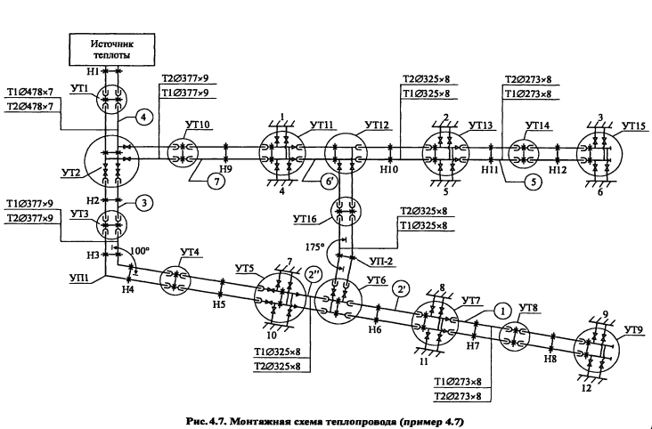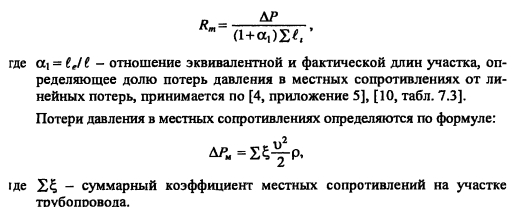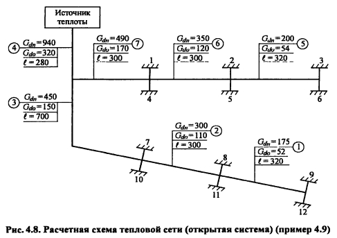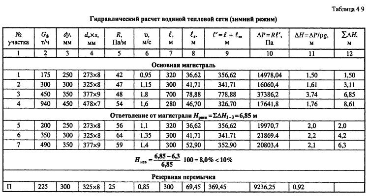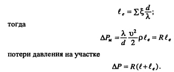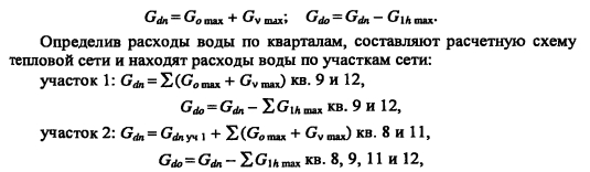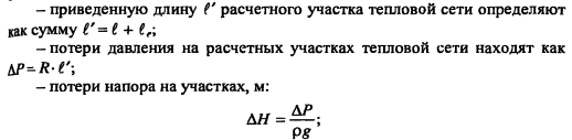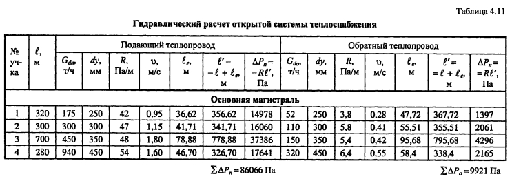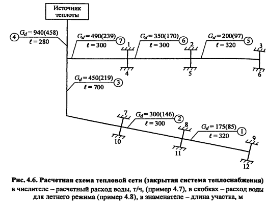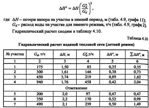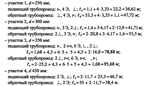 Гидравлический расчет водяных тепловых сетейВ задачу гидравлического расчета входит определение диаметров теплопроводов, давления в различных точках сети и потерь давления на участках. Последние складываются из потерь давления на трение по длине трубопровода (линейные потери) и в местных сопротивлениях: ![]() Удельные потери давления на трение должны определяться на основании технико-экономических расчетов. В курсовом проекте, когда располагаемый перепад давления в тепловой сети не задан, удельные потери давления в магистральных теплопроводах следует принимать в пределах 30-80 Па/м, для ответвлений - по располагаемому давлению. При заданном перепаде давления по всей сети АР, средние удельные потери давления определяют по формуле ![]() Значения коэффициентов местных сопротивлений приведены в [2, табл. 4,15], [10, табл. 7.1]. Потери давления в местных сопротивлениях можно заменить эквивалентными гидравлическими сопротивлениями по длине, т.е. на такую ну прямолинейного трубопровода ?- линейные потери давления в которое численно равны потерям давления в местных сопротивлениях ![]() Значения эквивалентных длин местных сопротивлений приведены в [10, табл. 7.2], [9, прилож. 17], [11, прилож. 15]. При определении потерь давления (напора) на участках тепловой сети по сумме коэффициентов местных сопротивлений потери напора находят как ![]() Потери напора в местных сопротивлениях определяют по номограмме [2, рис. 4.34] в зависимости от Х? и V. Гидравлический расчет закрытой системы теплоснабжения выполняется для подающего теплопровода, принимая диаметр обратного теплопровода и падение давления в нем такими же, как и в подающем. Гидравлический расчет водяных тепловых сетей производят для зимнего, летнего режимов, а также для аварийного режима в зимний период. Гидравлический расчет открытой системы теплоснабжения для зимнего периода выполняют для двух режимов: 1) при отсутствии водоразбора на горячее водоснабжение, когда расчетные расходы теплоносителя, а следовательно, и потери давления в подающем и обратном теплопроводах будут равными (расчет производят только для подающего теплопровода); 2) при максимальном водоразборе на горячее водоснабжение из обратного теплопровода (расчет выполняют для подающего и обратного теплопроводов). Гидравлический расчет производят в следующей последовательности: - выбирают на трассе тепловых сетей расчетную магистраль, как правило, наиболее протяженную и загруженную, соединяющую источник теплоты с дальними потребителями; - разбивают тепловую сеть на расчетные участки, определяют согласно разделу 4.5 расчетные расходы теплоносителя Gd и измеряют по генплану длину участков; - задавшись удельными потерями давлений на трение R (30-80 Па/м), доходя из расходов теплоносителя на участках, по таблицам или номограммам [2, номограммы 4.27-г4.33], [9, рис. VI.2], [10, рис. 7.2], [11, рис. П 15.4] составленным для труб с коэффициентом эквивалентной шероховатости А = 0,5 мм, находят диаметр теплопровода, действительные удельные потери давления на трение и скорость движения теплоносителя, которая должна быть не более 3,5 м/с; - определив диаметры расчетных участков тепловой сети, разрабатывают монтажную схему теплопроводов, размещая по трассе запорную арматуру, неподвижные опоры, компенсаторы (см. раздел 4.6); - по монтажной схеме устанавливают местные сопрот