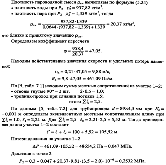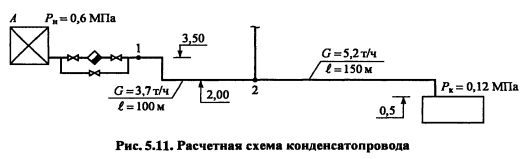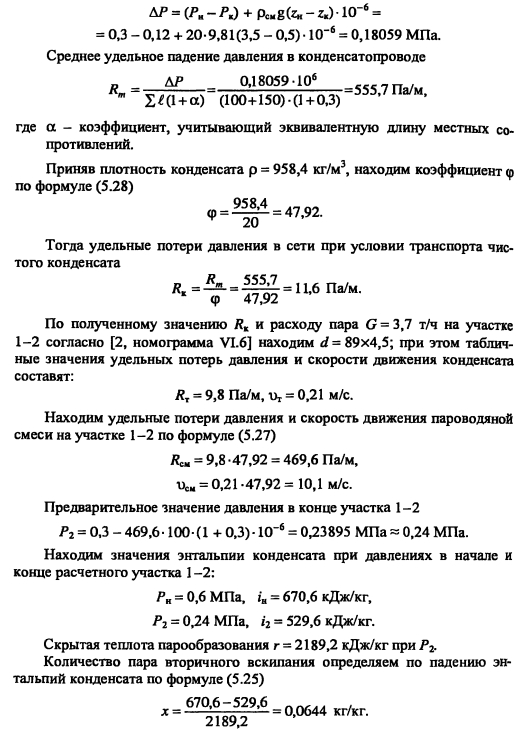 Гидравлический расчет конденсатопроводовКонденсатопроводы подразделяются на сборные и напорные. Сборные конденсатопроводы служат для транспорта конденсата от паропотребляющих приборов до конденсатных баков. В таких конденсатопроводах в связи с падением давления возможно частичное вскипание конденсата, когда его температура превышает соответствующую температуру насыщения. Кроме того, возможно прохождение пара в конденсатопровод через конденсатоотводчики при их неисправности. В результате по конденсатопроводу перемещается пароводяная смесь. Такие конденсатопроводы называются двухфазными. Напорные конденсатопроводы служат для транспорта конденсата от сборных баков до источника теплоты. В данных конденсатопроводах обеспечивается давление, исключающее вторичное вскипание, конденсат транспортируется, занимая полное сечение трубопровода. Напорные конденсатопроводы рассчитываются аналогично трубопроводам водяных тепловых сетей, при этом используются таблицы или номограммы, составленные для труб с 1,0 мм. Диаметр напорного конденсатопровода определяют по расходу конденсата и удельному падению давления по длине, которое должно быть не более 100 Па/м. Гидравлический расчет двухфазных конденсатопроводов производят с учетом средней плотности пароводяной смеси, получающейся в результате вскипания конденсата. Плотность пароводяной смеси определяется по формуле [3]: ![]() При гидравлическом расчете двухфазных конденсатопроводов удельные потери давления на трение определяют по располагаемому перепаду давления при скорости смеси не более указанных в табл. 5.3 для насыщенного пара. Располагаемое падение давления АР определяется с учетом разности геодезических отметок начала и конца расчетного участка ![]() В первую очередь производят расчет основной расчетной магистрали согласно [2, номограмма VI.6], значения потерь давления на трение и скорости пересчитывают с учетом коэффициента <р, учитывающего увеличение потерь давления и скорости движения при транспортировке пароводяной смеси ![]() Затем рассчитывают остальные участки с обязательной увязкой всех ответвлений. ПРИМЕР 5.7. Рассчитать сборный конденсатопровод от потребителя А до бака для сбора конденсата (рис. 5.11), если давление в теплообменнике (абсолютное) 0,6 МПа, в сборном баке конденсата 0,12 МПа (абсолютное). Расходы конденсата, длины участков и геодезические отметки показаны на рис. 5.11. ![]() Решение. Давление в конденсатопроводе после конденсатоотводчика 0,5 0,5 0,6 = 0,3 МПа. Предварительно принимаем среднюю плотность в конденсатопроводе 20 кг/м3. Располагаемый перепад давлений в расчетной магистрали с учетом геодезических отметок в крайних точках магистрали: ![]() ![]() |